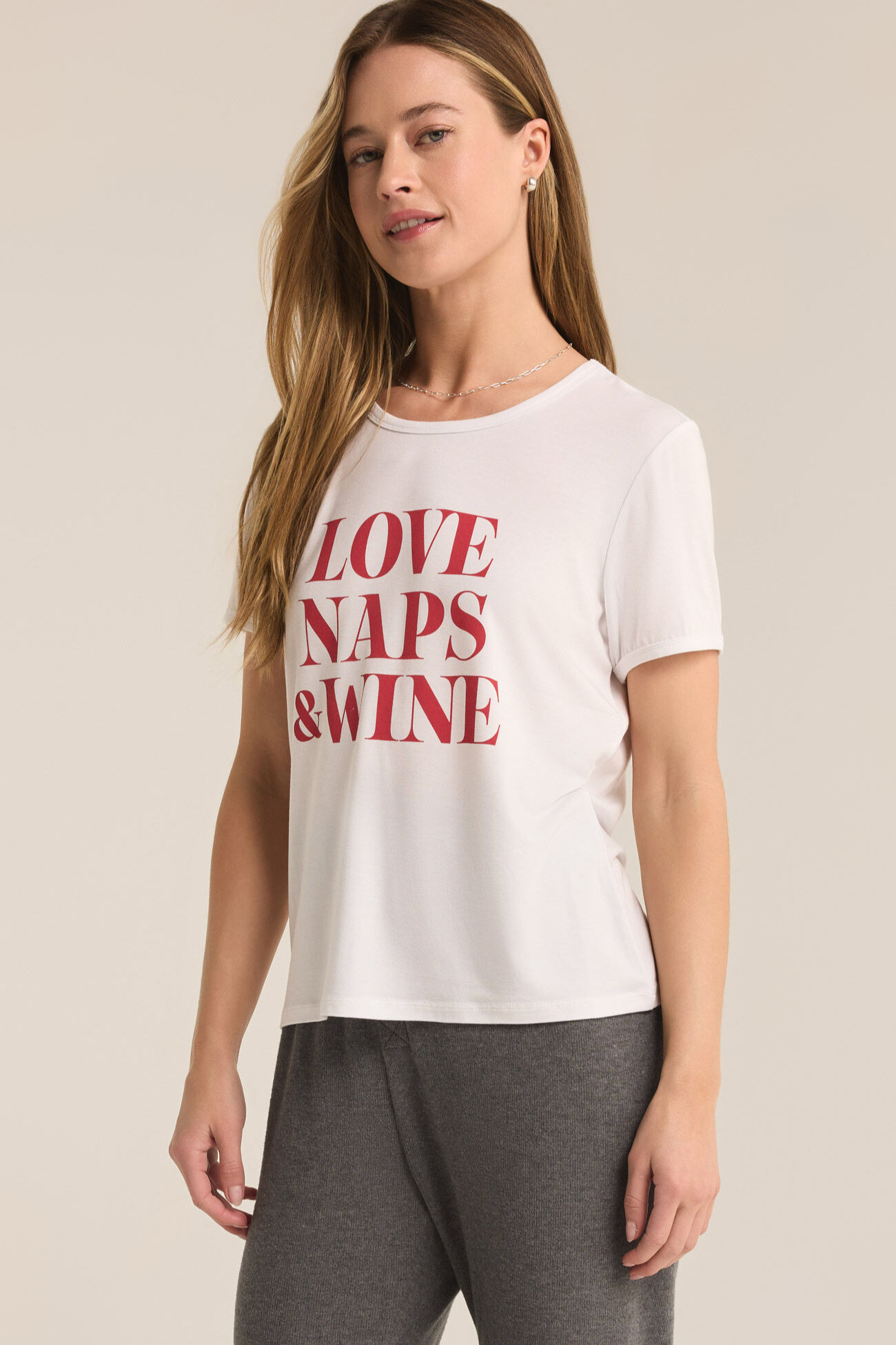 The Naps Love Short Sleeve Top is a soft mid-weight top with “Love Naps and Wine” detail on front.