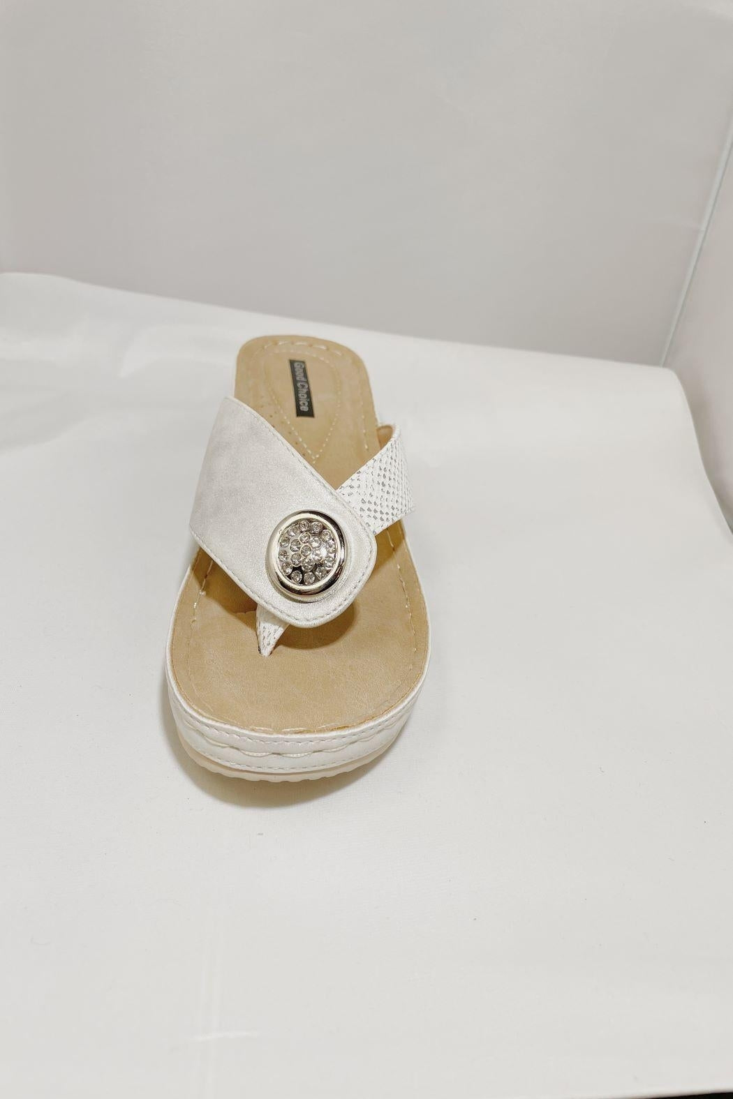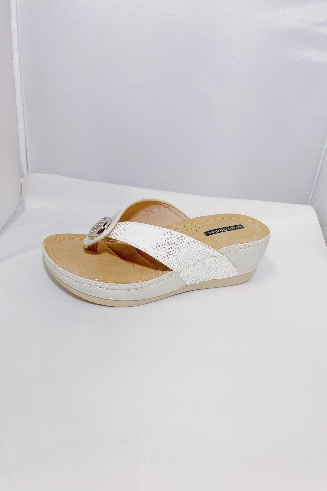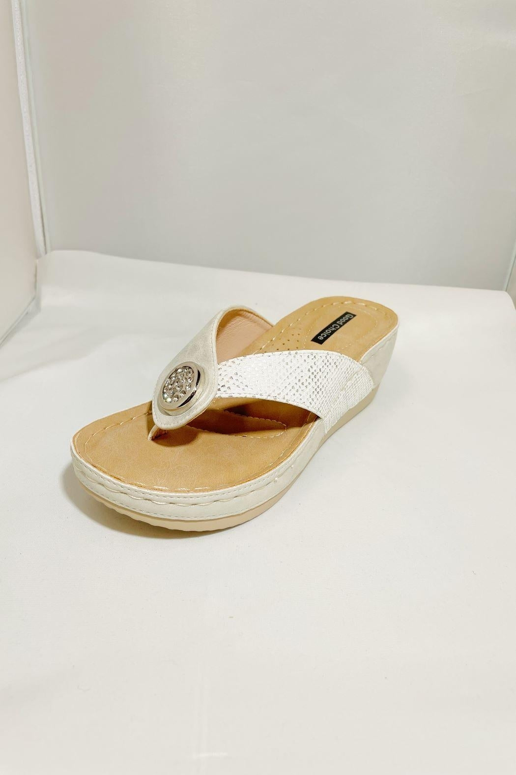 This low wedge sandal is very versatile to wear with anything. The neutral colors can be paired nice with anything in your closet. The wedge height is only 2" so a very comfortable shoe and they also are part of a comfort collection which means they have extra cushioning in them. The straps have different textures which adds a fun touch to them along with the sparkle on the front.