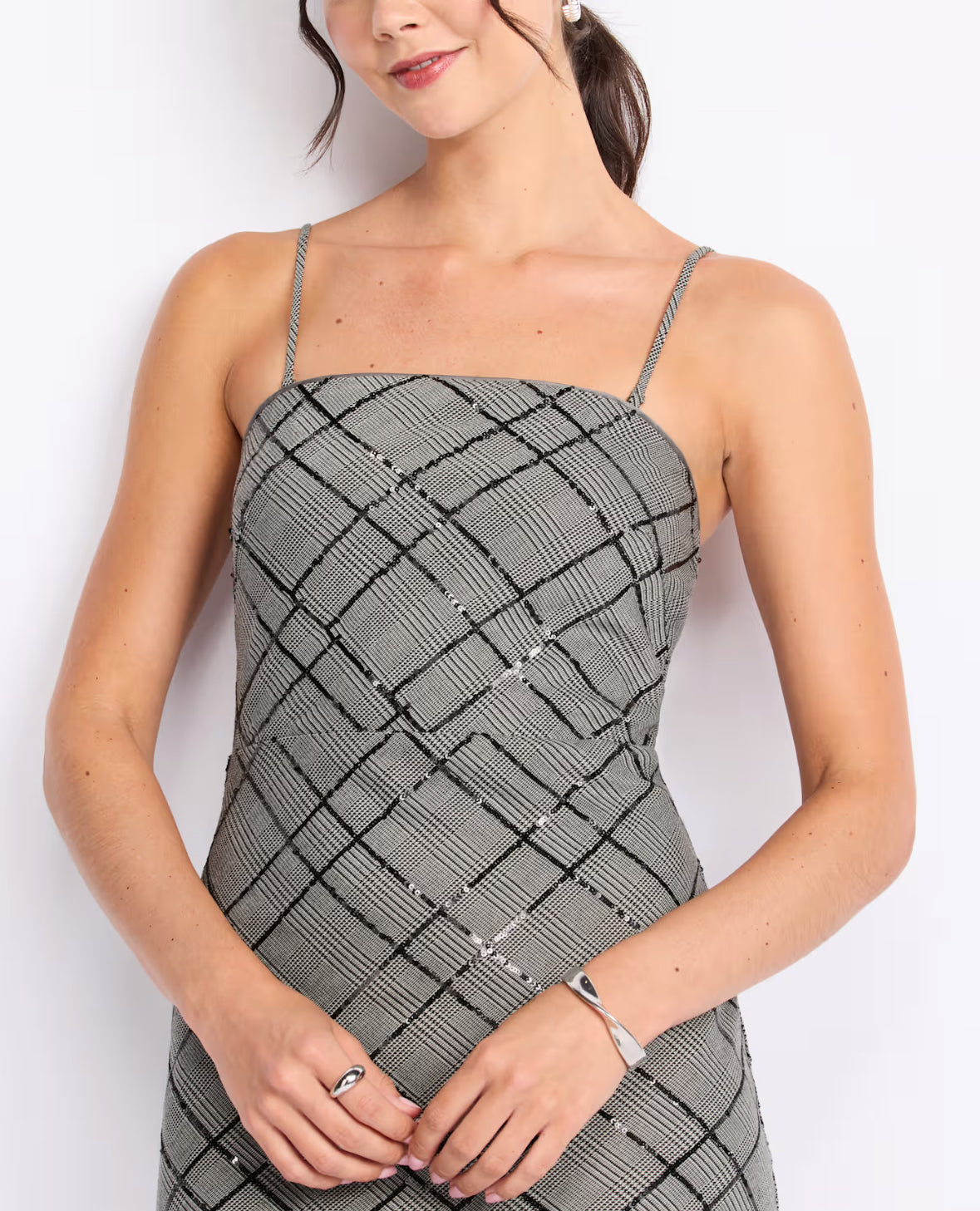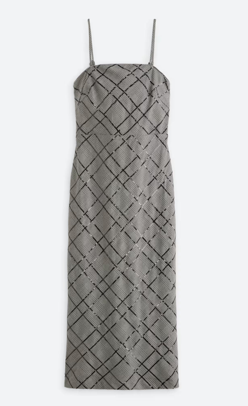 A sleek plaid midi dress with a modern, tailored fit. Features a square neckline, thin adjustable straps, and a smocked back for comfort and stretch. Subtle shimmer accents elevate the classic plaid design, making it perfect for both daytime sophistication and evening occasions. Pair with heels for a chic, refined look.