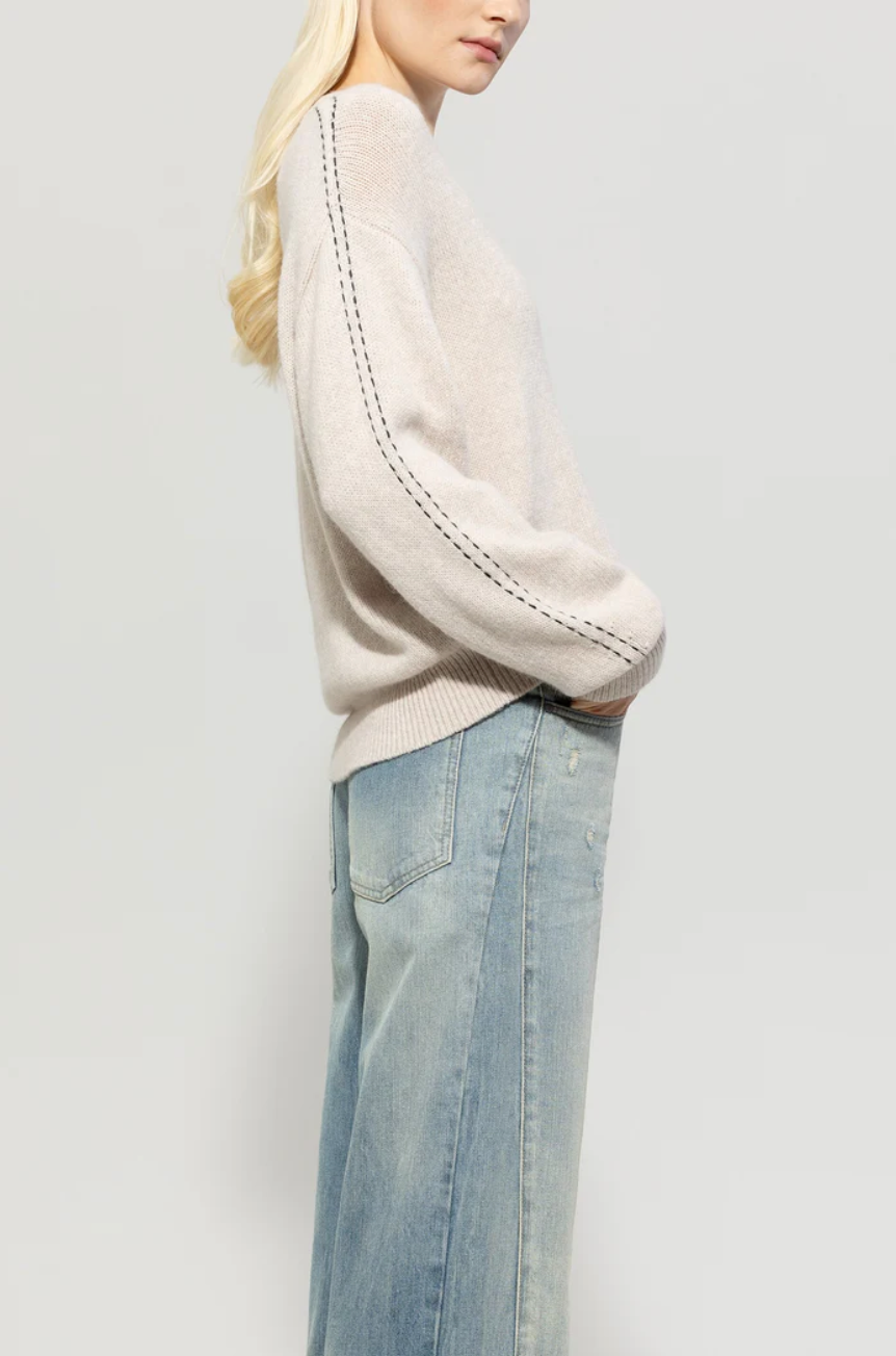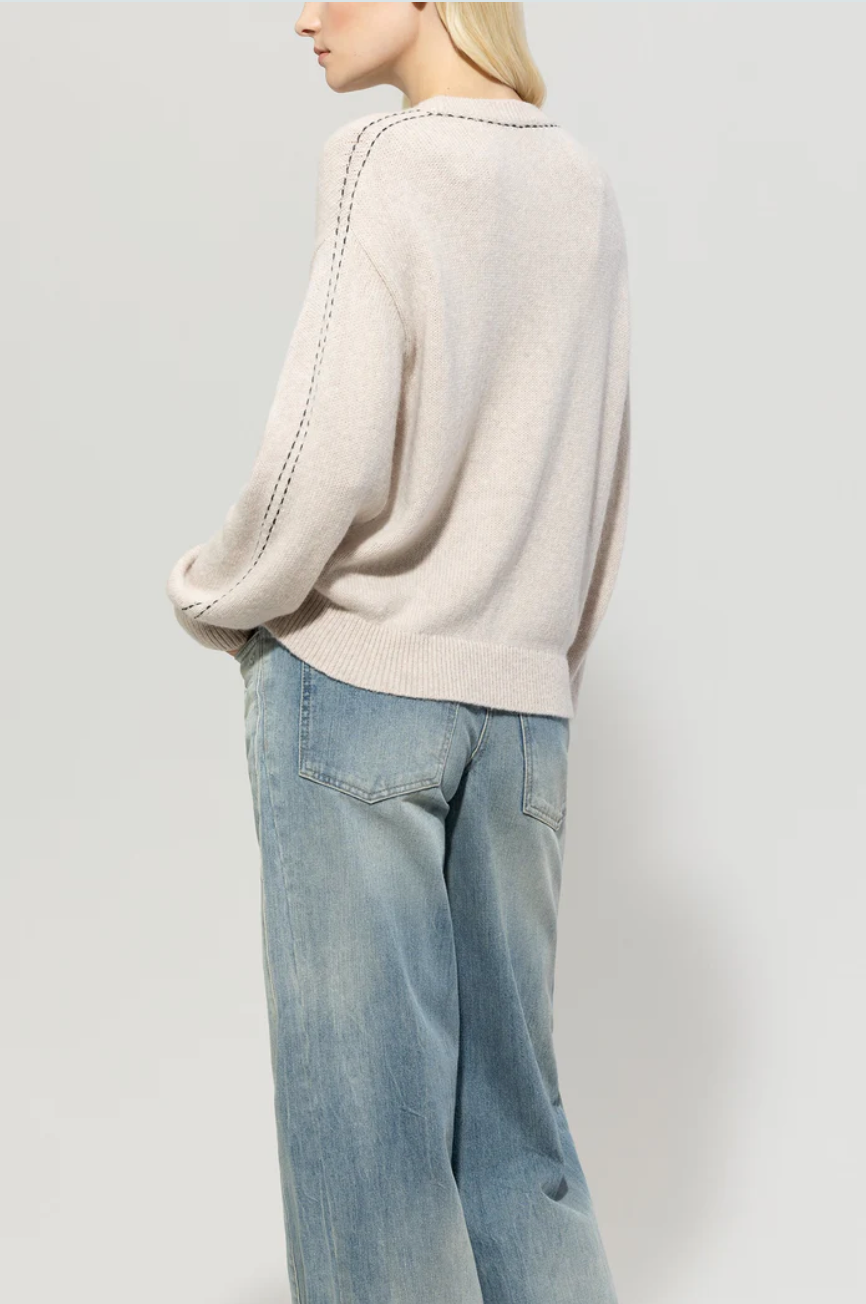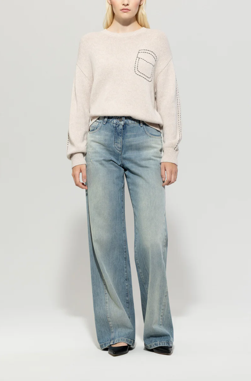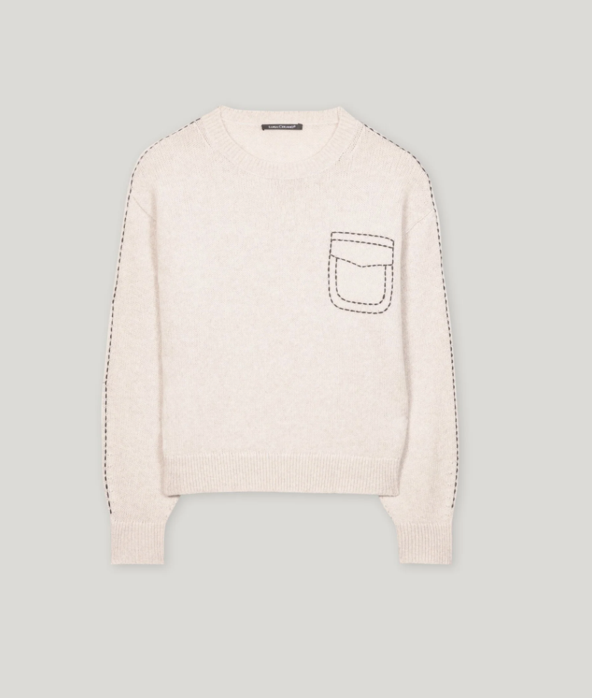 Knitted sweater made from high-quality, Italian lightweight yarn with a very soft feel and ribbed cuffs. Embroidered details indicate a breast pocket and stitching on the sleeves.