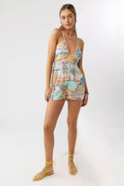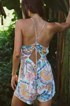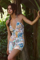 Soak in some sunny vibes in this woven romper. It has a colorful print design and a cross back strap detail.