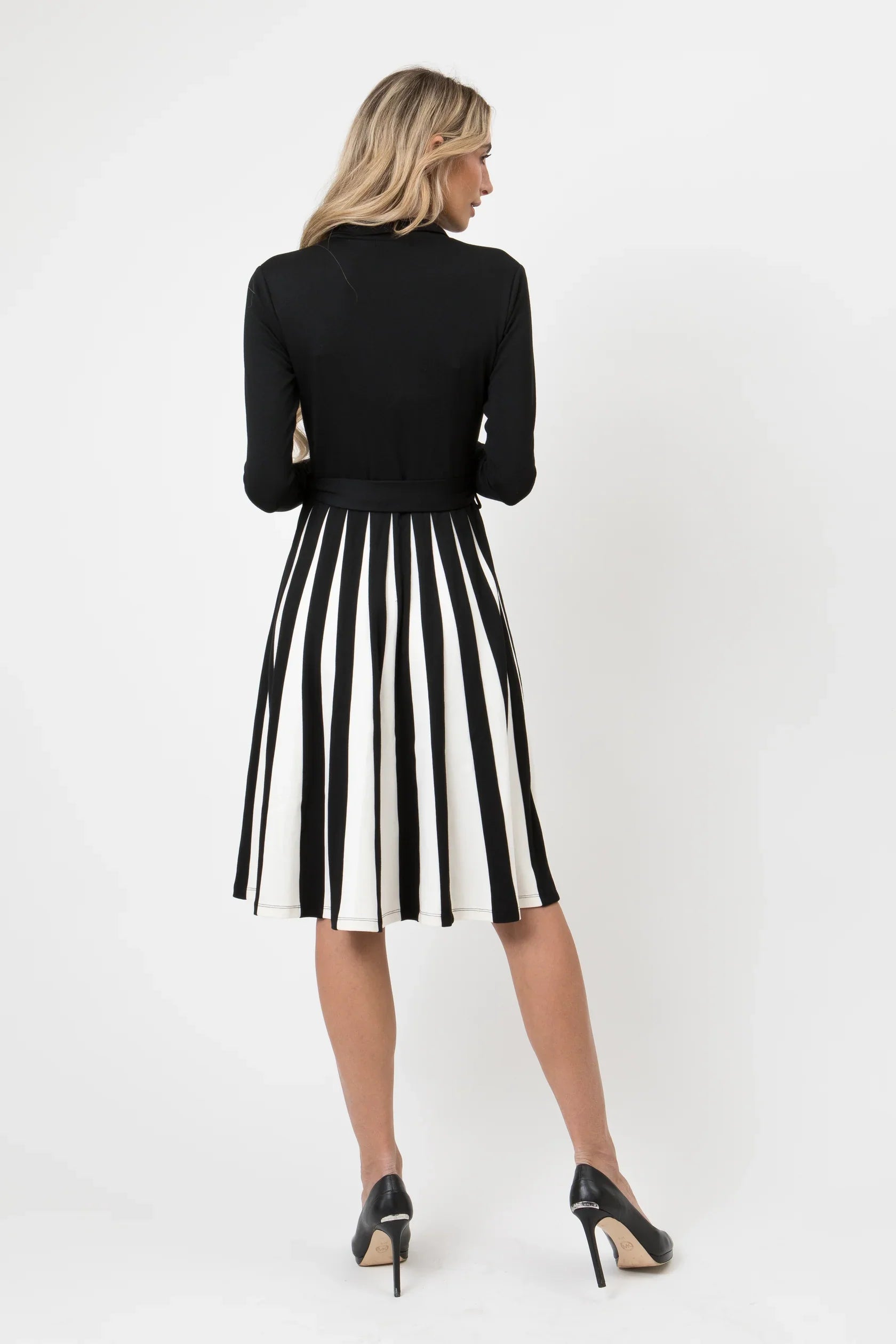 This elegant though vogue dress is intricately designed, featuring a full skirt with contrasting white godet pleats. Beautifully developed from a high quality, rich knitted ponti fabric, this dress is easy to wear, while still functioning as a formal, event ready piece. This masterpiece is designed with a fitted bodice, and perfectly placed godet pleats, creating a flattering shape on all body types. The white godets peer through the black fabric of the dress, creating spectacular, vivacious motion with every step. This dress exudes an effortless elegance that makes it perfect for any event. Get ready to make this your new favorite repeat piece for every semi-formal occasion. TAN-002
