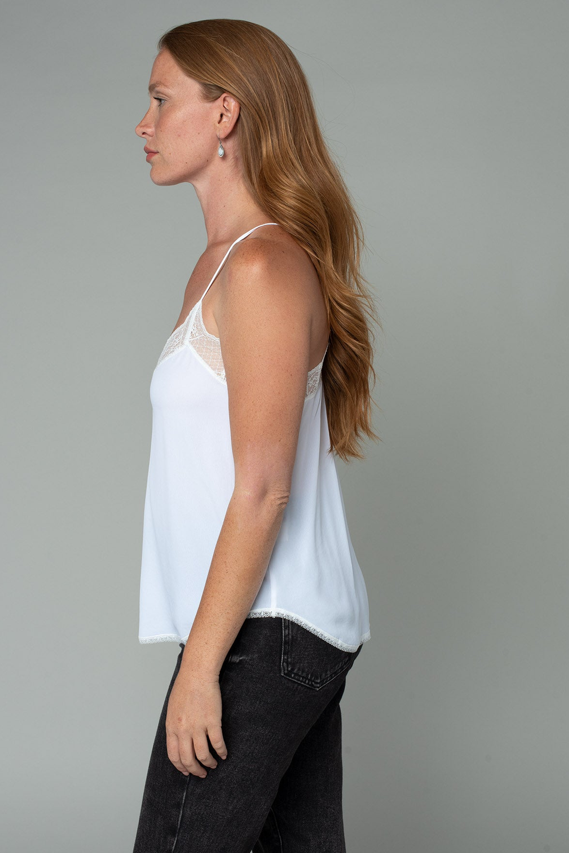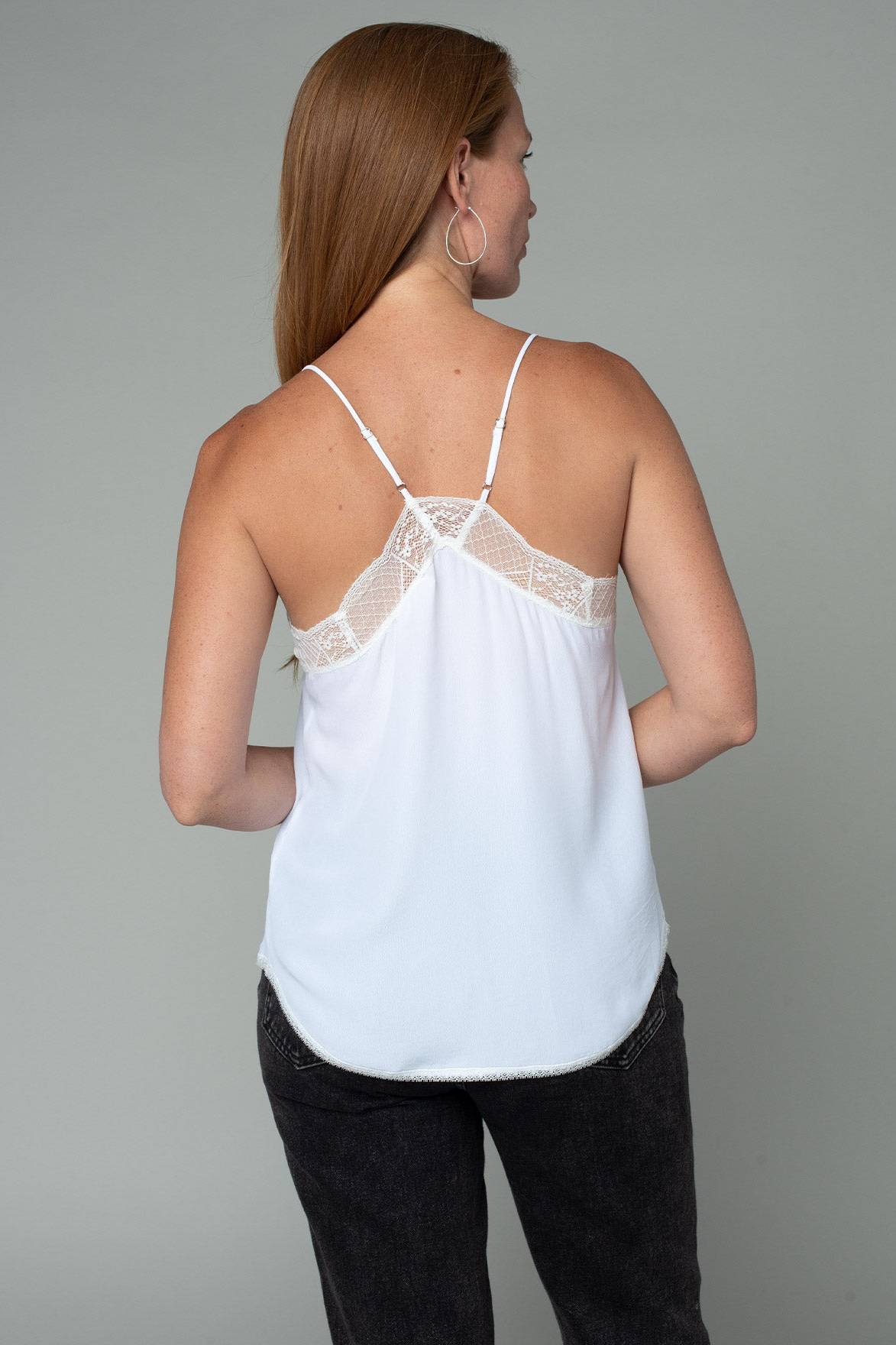 Our popular lace trim camisole is back, reimagined in a sumptuously soft and silky crepe. With a lace-trimmed v-neckline, a flattering racerback, and delicate thin spaghetti straps. The perfect layering style, try it under a cozy oversize sweater or style it on its own for a night out.