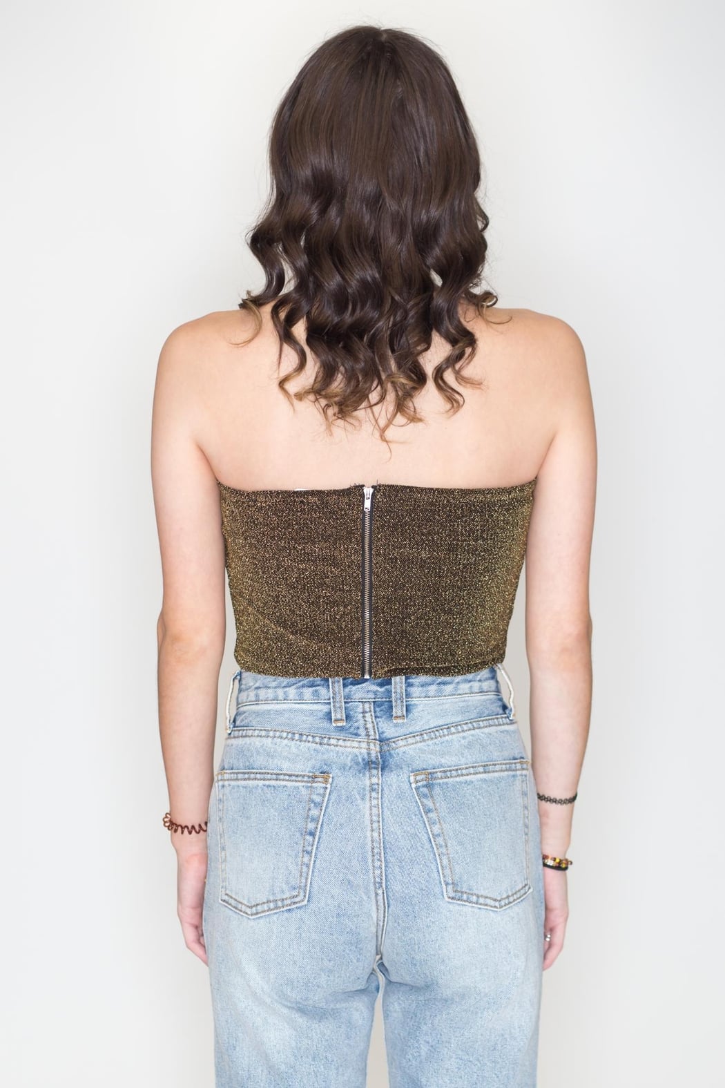 Gold lurex crop top with sweetheart neckline and back zipper closure.