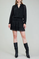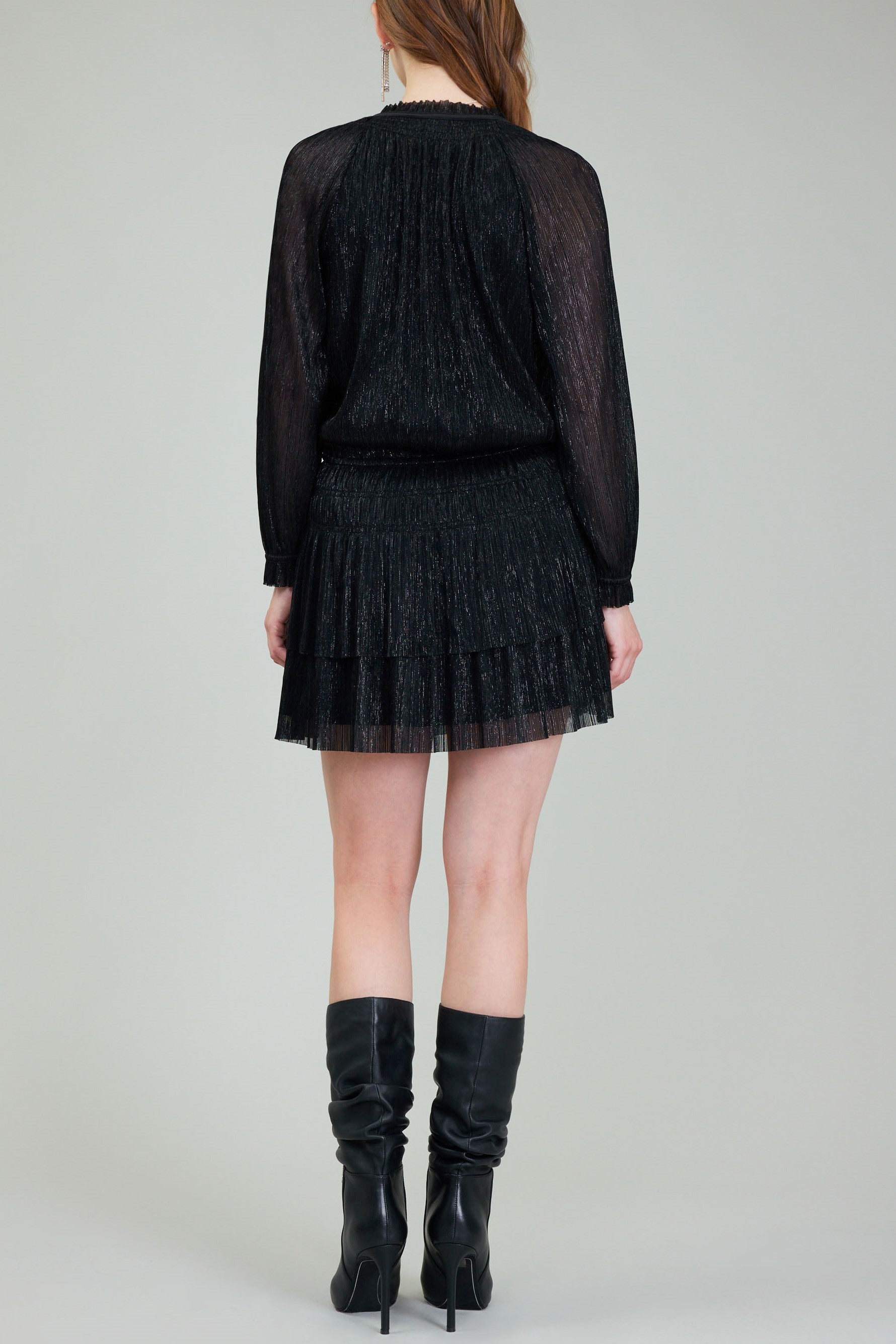 This black lurex mini dress features long sleeves and pleated detailing on the bottom, creating a glamorous and sophisticated look. The pleats add subtle texture and movement, while the lurex material adds a touch of sparkle. Perfect for any special occasion, this dress will make you stand out in style.