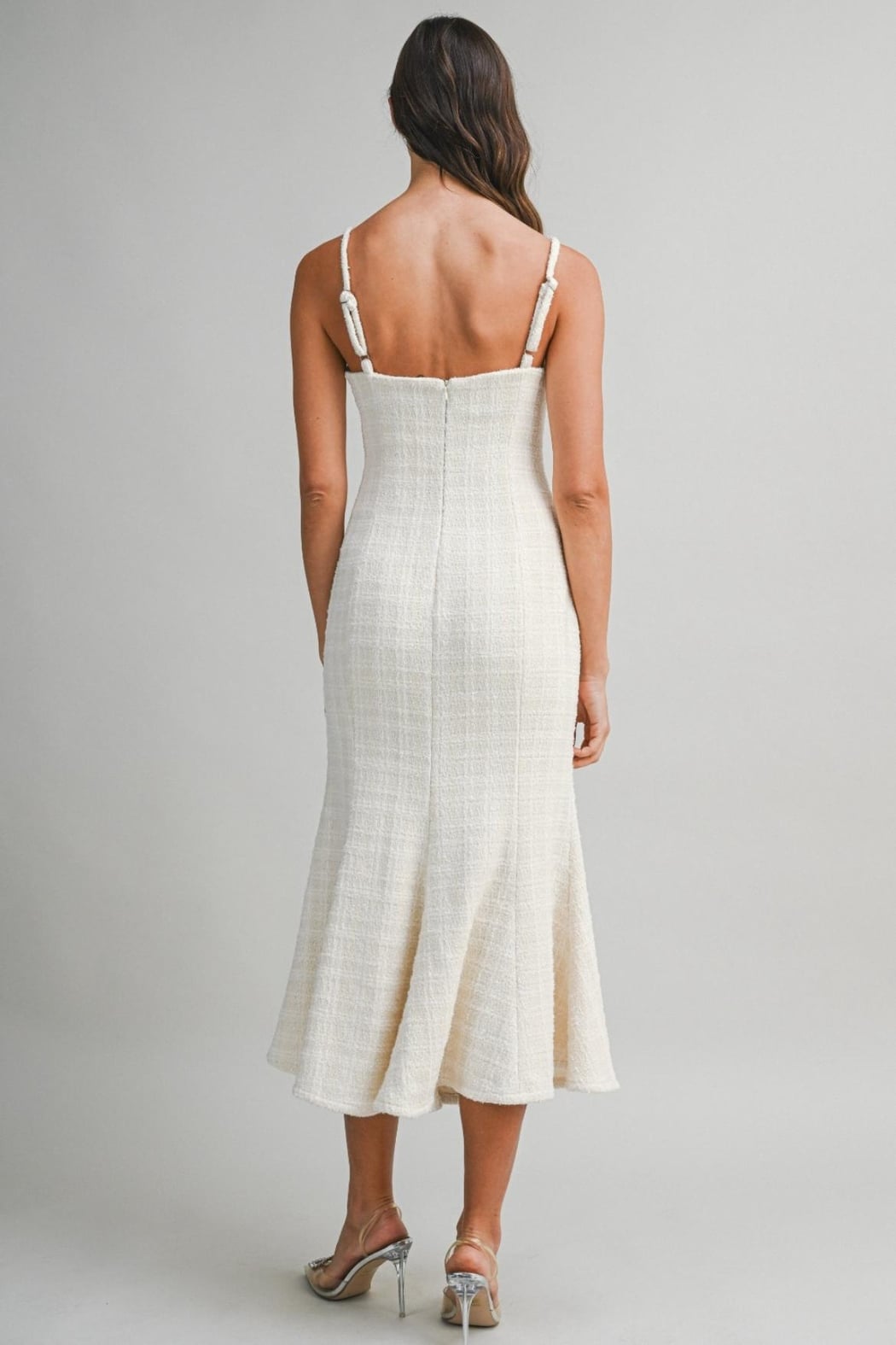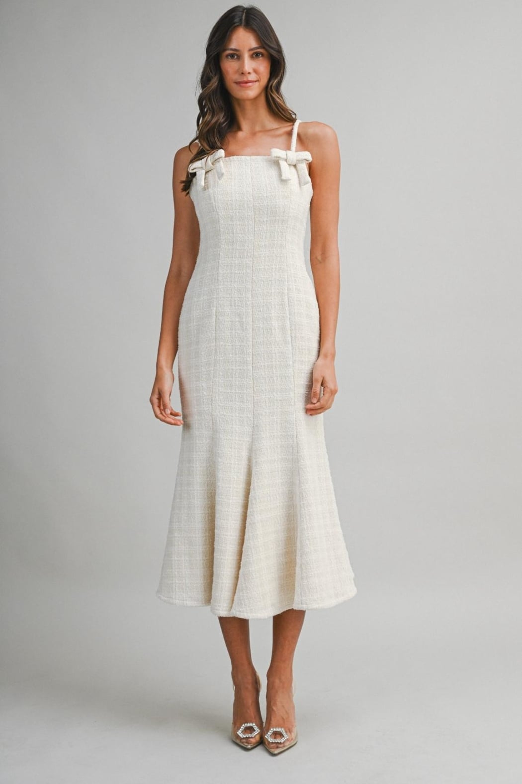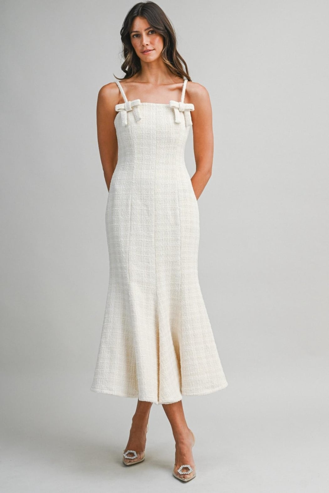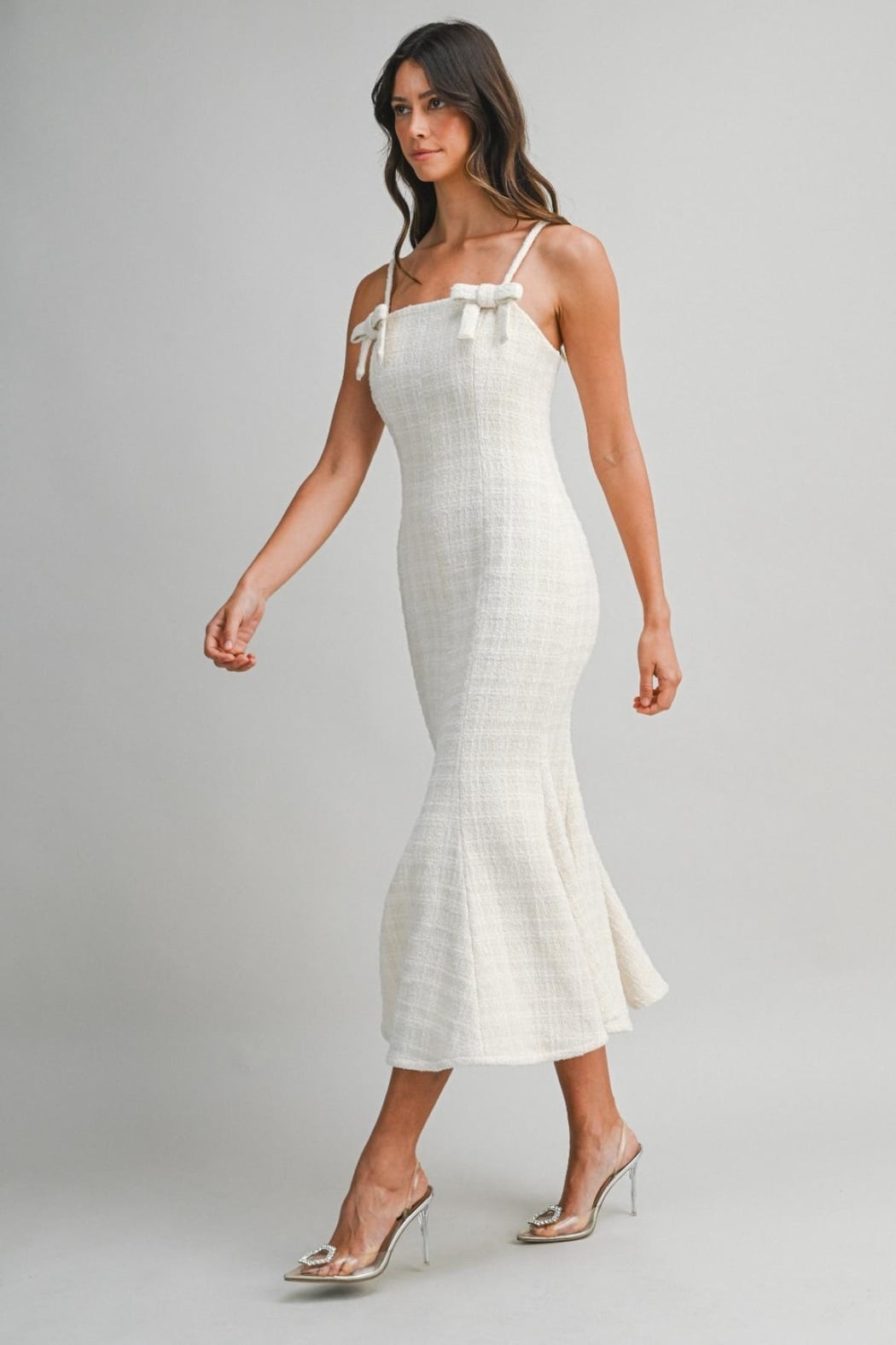 Lurex tweed mermaid midi dress with bow detail. Model is wearing a size Small