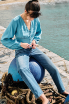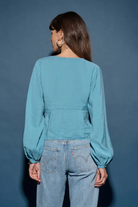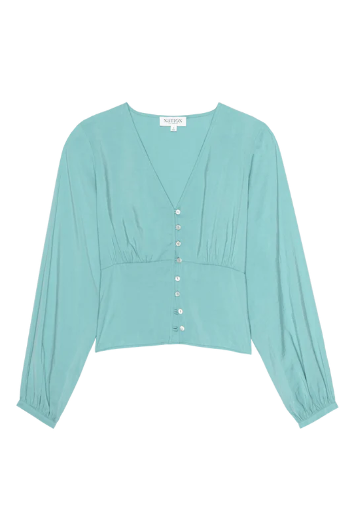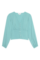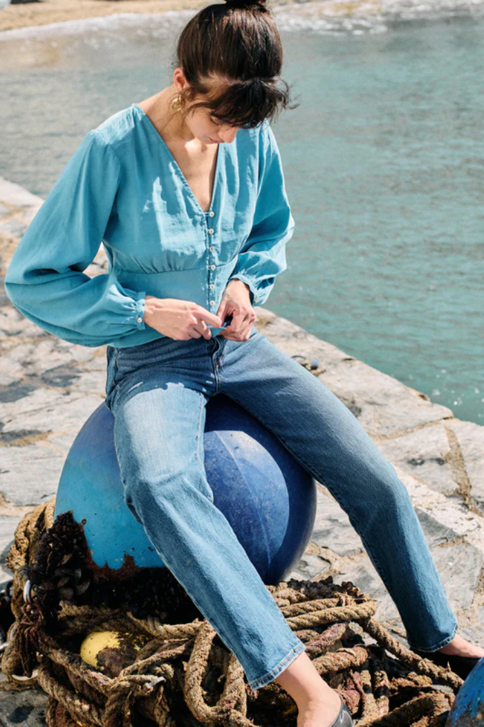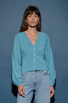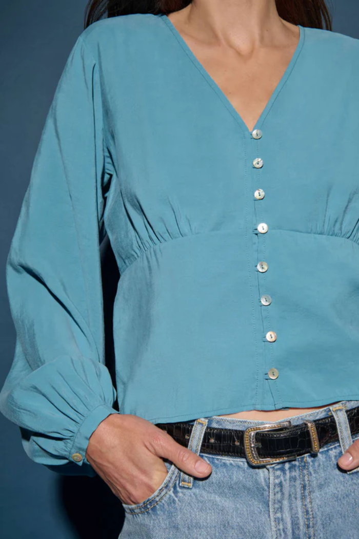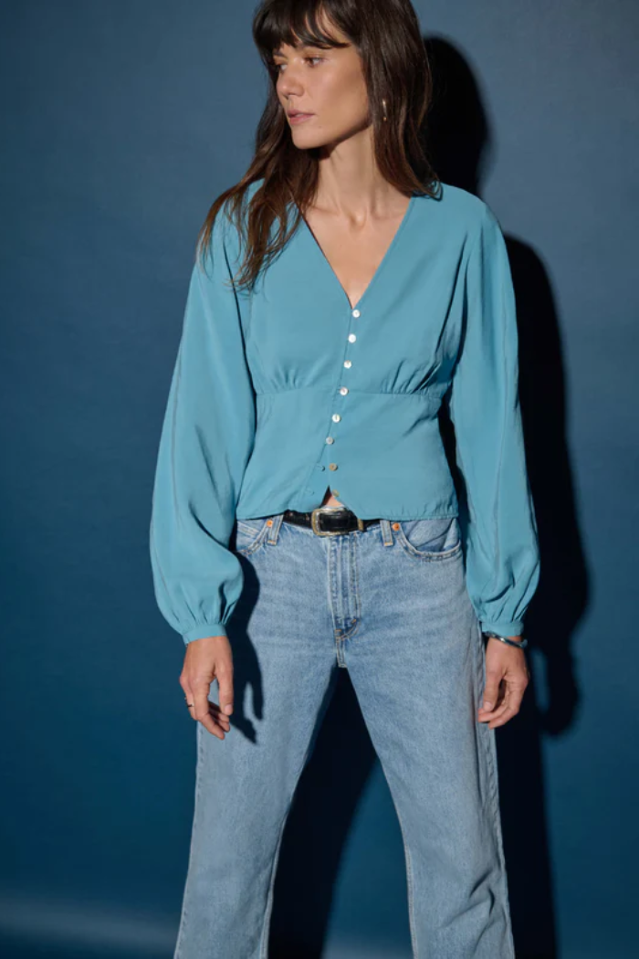 Our take on a sweet little button-down peasant blouse boasts a V-neckline, sleeve bands and voluminous balloon sleeves for just a touch of drama. (This one comes in Adriatic Sea.)