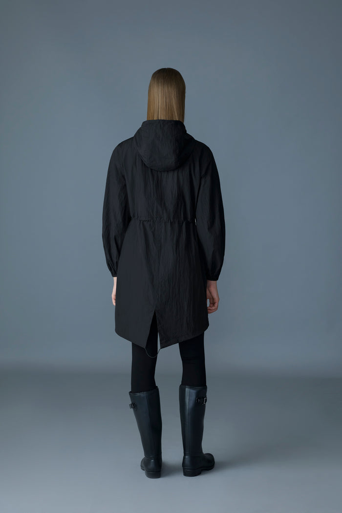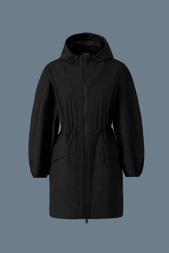 Stay stylish, sustainable, and dry with the Mackage Alyster Packable Long Rain Jacket. Made from 100% recycled nylon, this jacket boasts a water-resistant shell and adjustable drawcords for function and style. Don't let transitional weather catch you off guard - this versatile jacket is also packable into its own pockets.