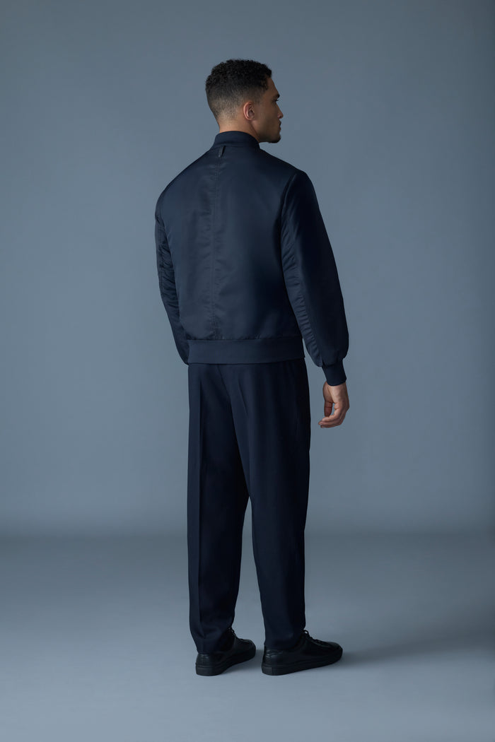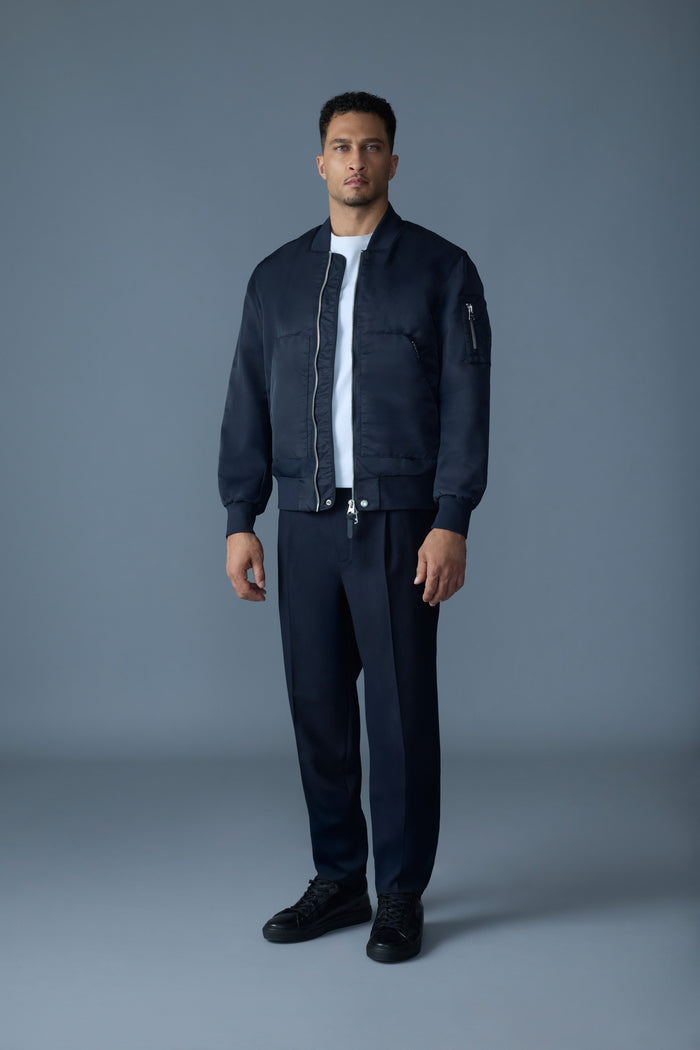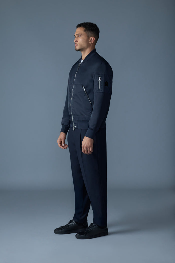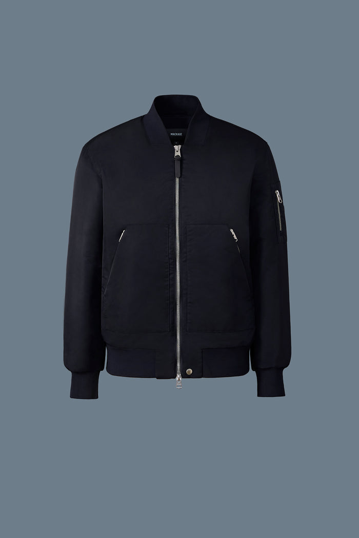 Introducing EMILIO, the satin bomber jacket by Mackage. Stay cozy with its full fleece jersey interior while looking stylish with a square neckline and rib knit details. Features functional patch pockets and underarm eyelets for ventilation. Complete with a metal M logo patch for a touch of brand charm.
