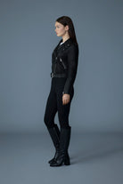 Ride in style with MASINA, the premium biker jacket made from lamb leather. The adjustable belt and fully lined interior offer a customized fit and extra warmth. This semi-fitted jacket boasts an asymmetrical closure and coin pocket detailing. Perfect for adventures and daily wear.