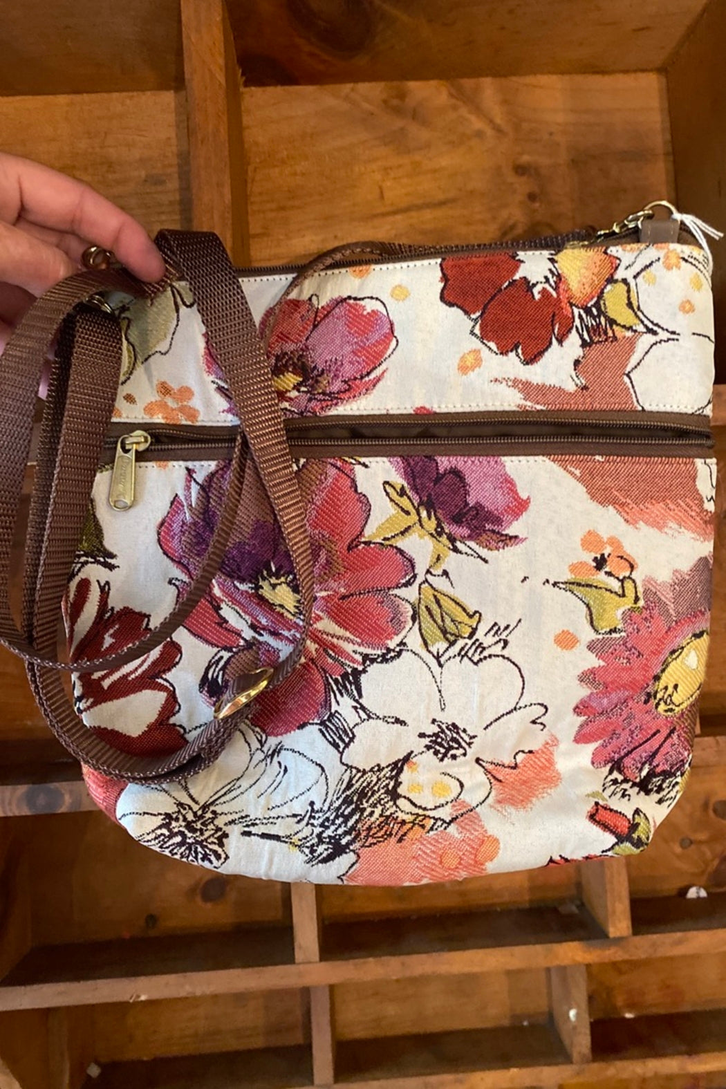 Medium sized, the Maggie Purse is 11" wide x 10.5 " high and 3" deep. It has an adjustable strap that changes from 12" to 56" so the bag may be worn as a shoulder bag, crossbody or even a clutch. There is a top zipper closure and an inside zipper pocket for valuables. Open front pocket and large zipper pocket on the front and back so its perfect for keys and cell phone.