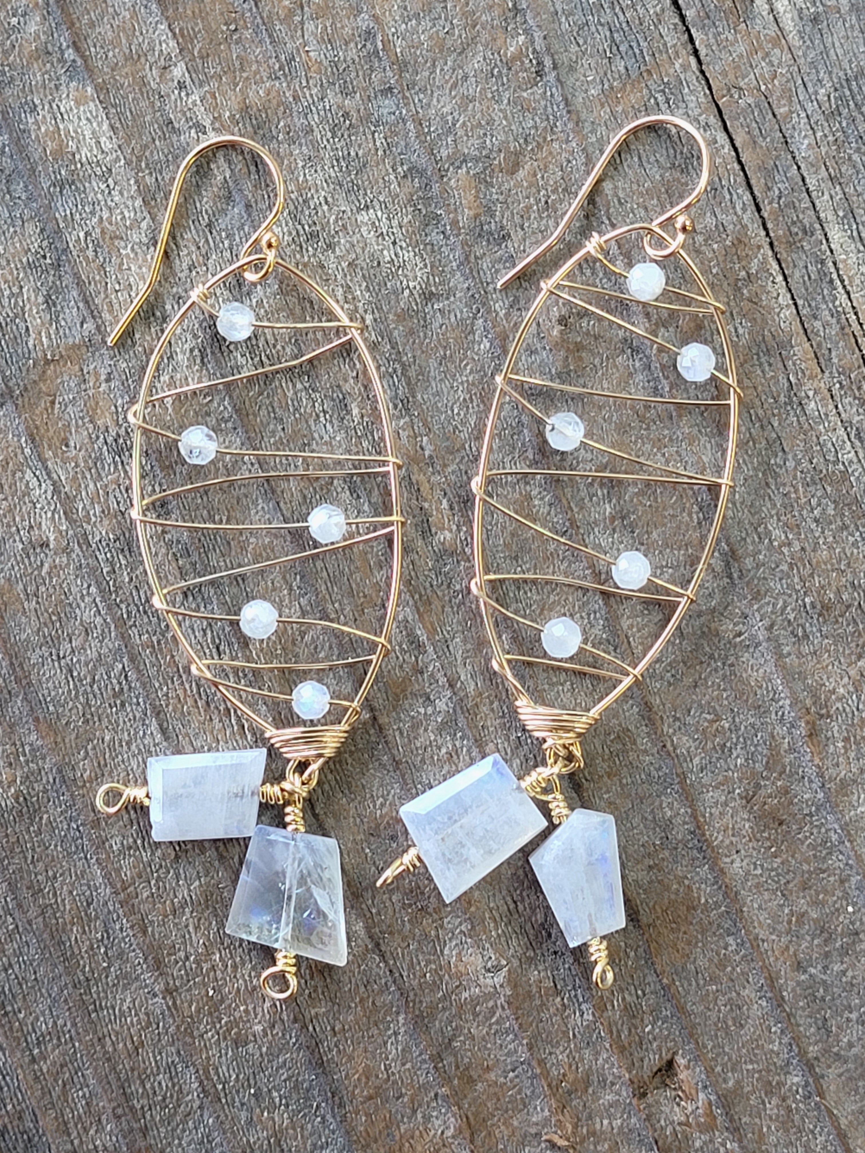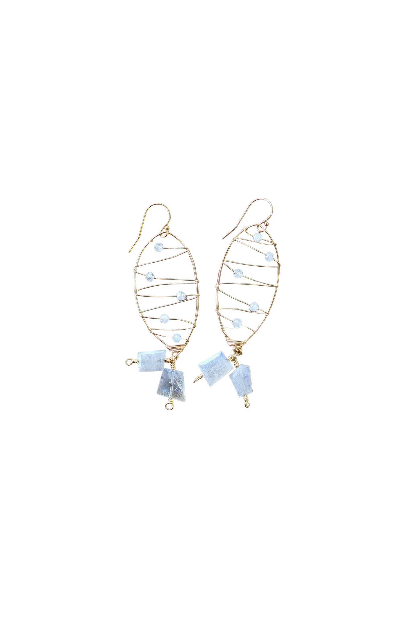 Gold dangle earrings in the shape of a dolphin tail with moonstone accent stones.