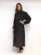 •LOOK: An updated paisley print is the highlight of this midi dress by Malou. Shaped at the waist for a great fit, the waistband is texturized to break up the print and add visual interest. Hidden back zipper, mock turtleneck and long, full sleeves. The designer's detail of print placement is subtle and sublime. The fabric is soft to the touch with a luxurious silky feel. The a-line shape is full and adds fluidity to the graceful movement when you walk and dance. Take advantage of the length to show off a great pair of shoes. This is an understated look, perfect for any special occasion on your social calendar this busy party season.