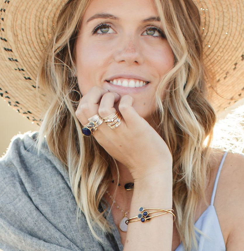 A wire wrap ring with grey Swarovski crystals and a rose gold or silver stardust bead. Available in four metal types.