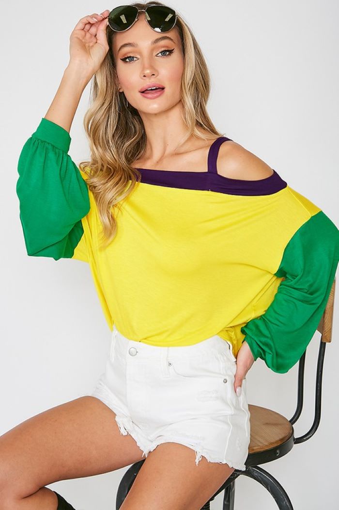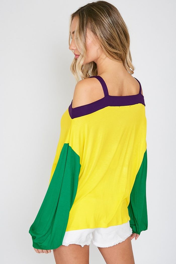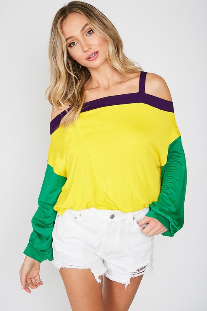 Be the best dressed one at the parades this year with this beautiful cold shoulder Mardi Gras top! This top features a color block pattern and has some stretch in the material. Runs true to size.