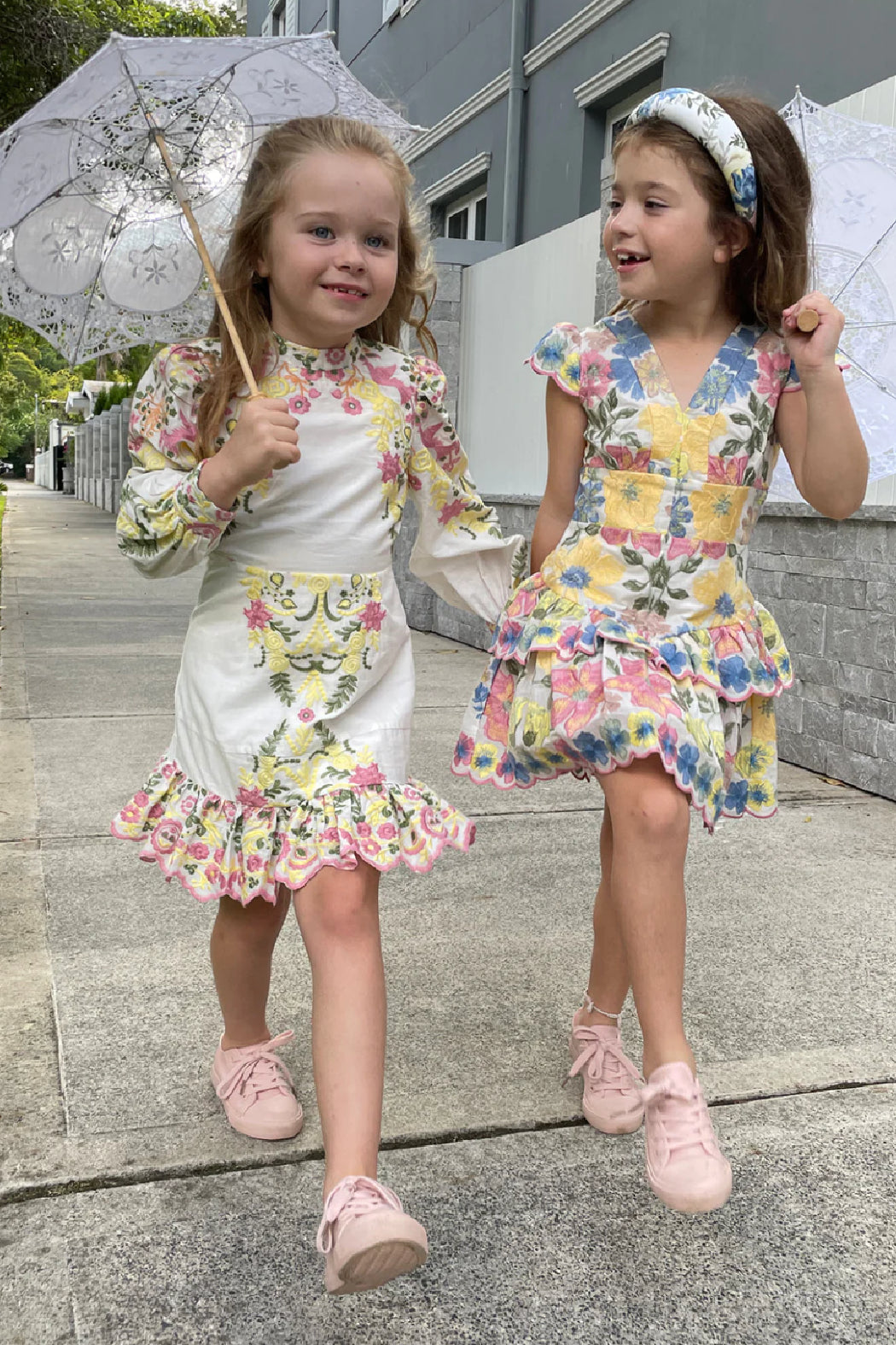 The Marielle Embroidered Dress is the epitome of cute and stylish. Exclusively designed with floral embroidery in cheerful shades of yellow, pink and blue, this mini dress will add a touch of charm to any occasion. Your little one will love twirling in this beautiful dress!