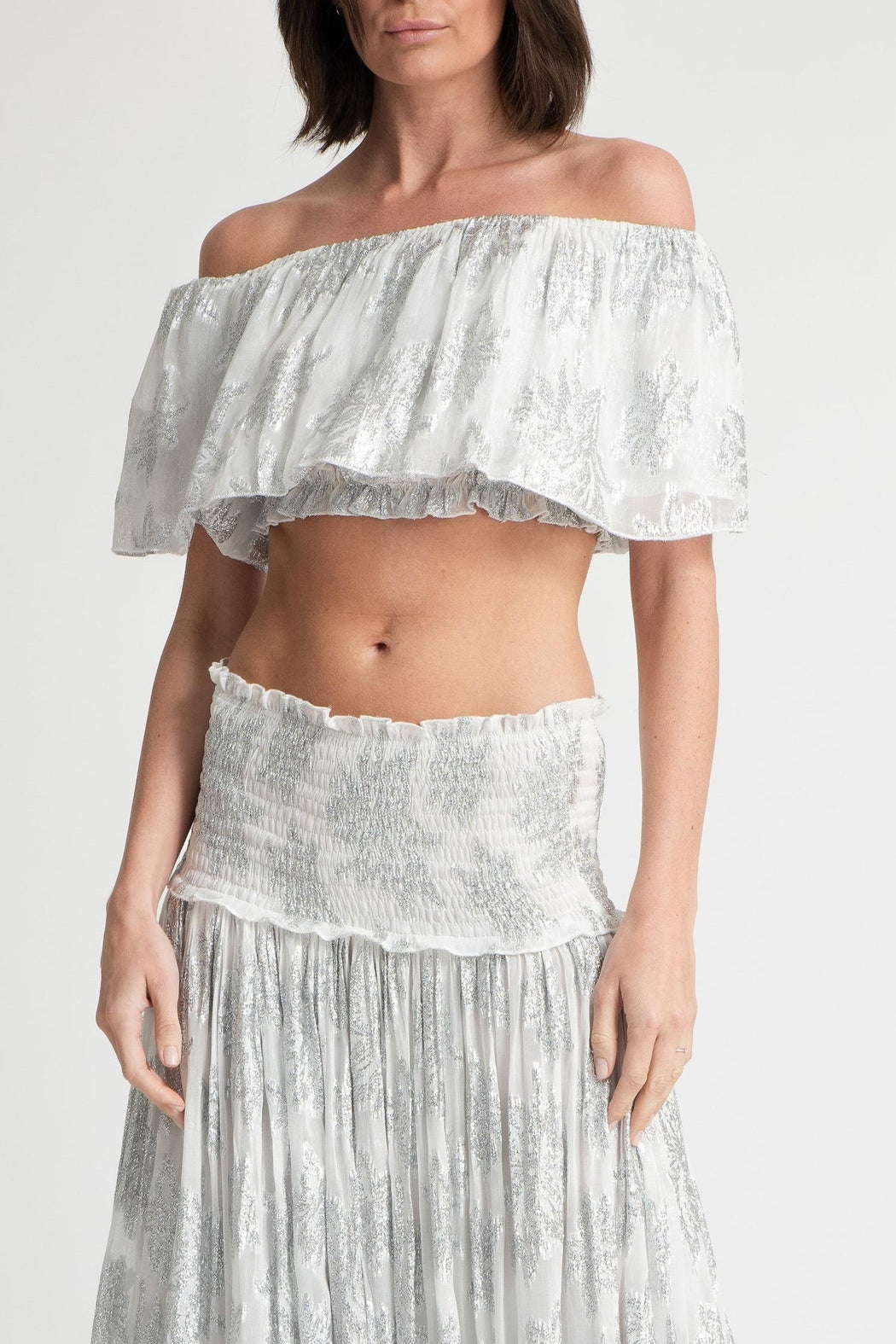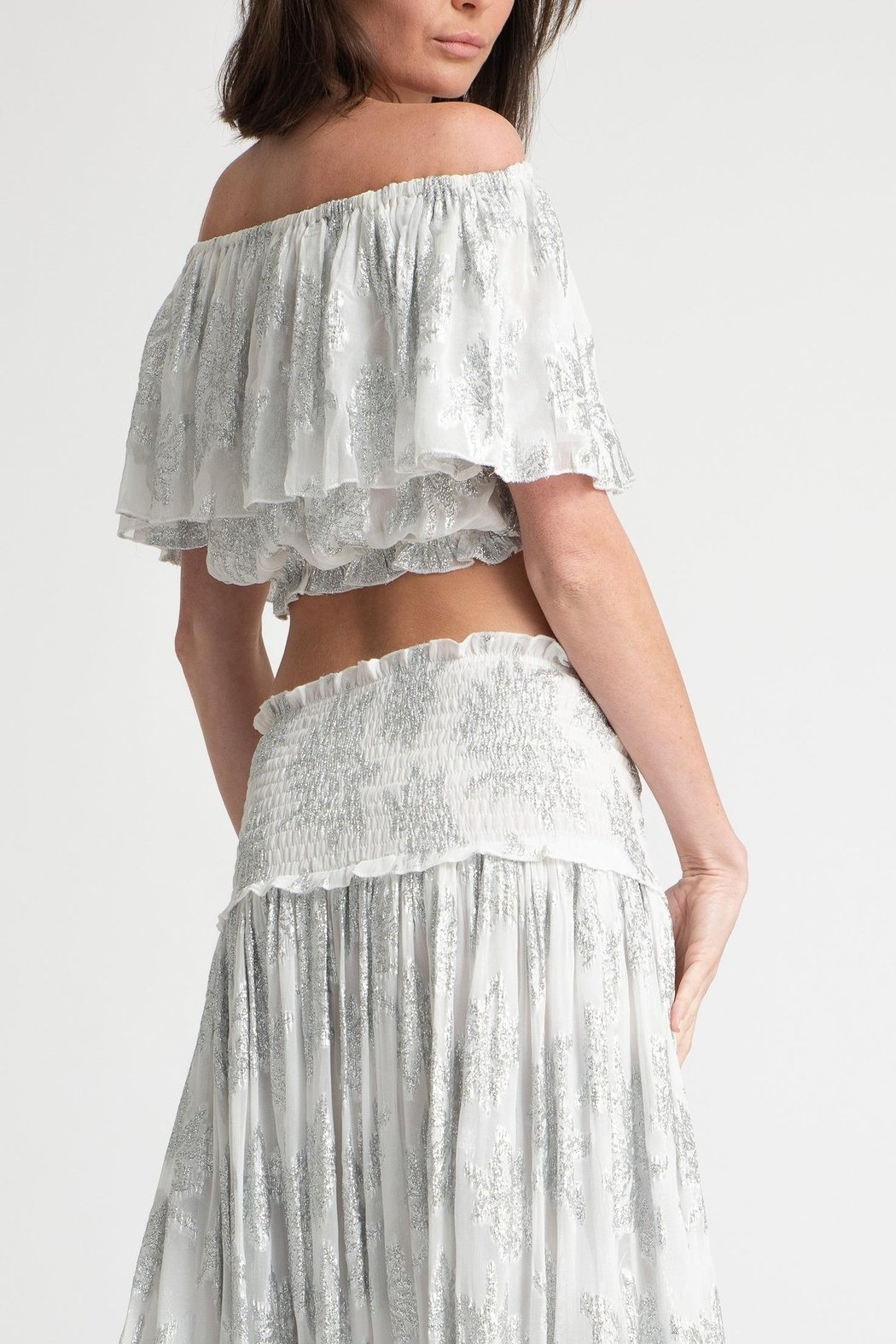 Marquise Cropped Top is designed for your summer days. Cut from a fil coupe silver metallic thread. Style with the matching maxi skirt !