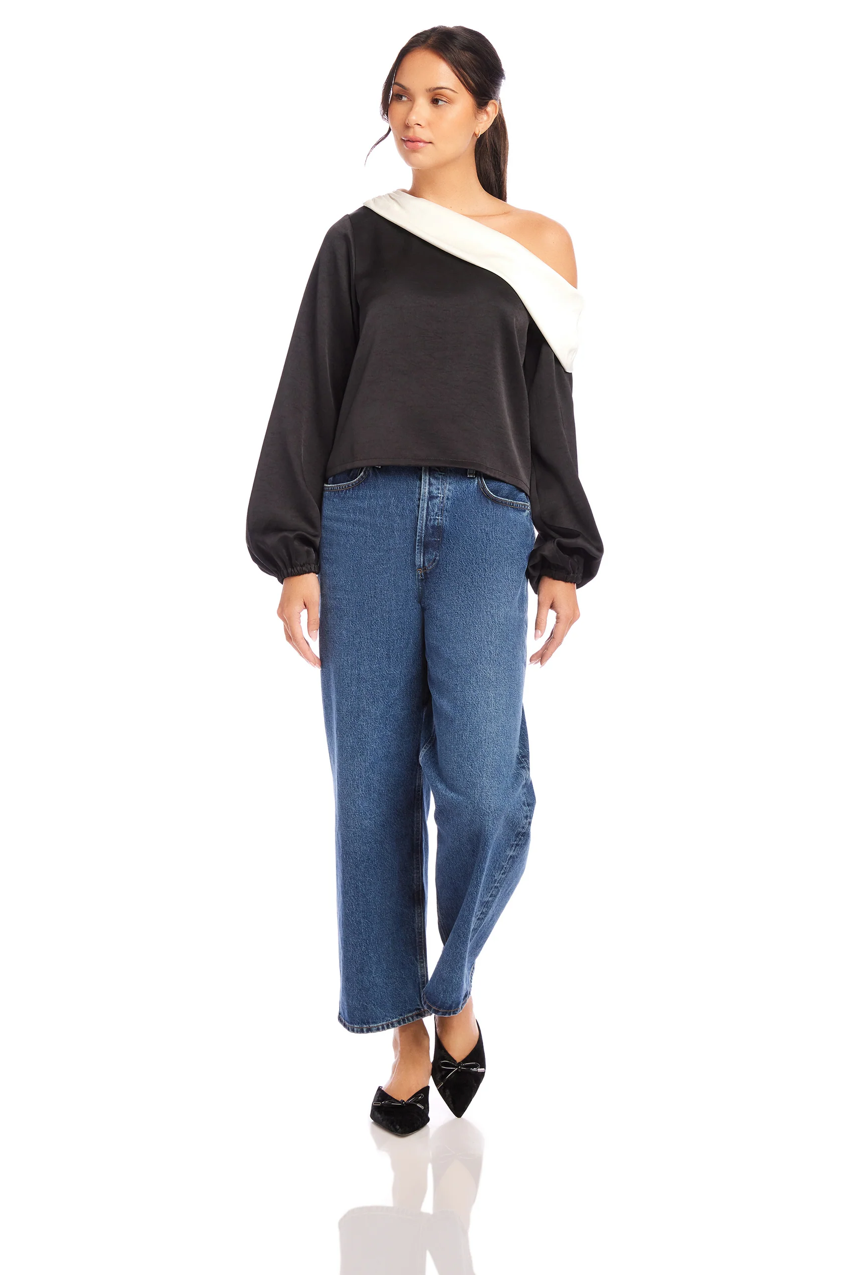 The Marisa One Shoulder Top boasts a chic color block design and is crafted from luxurious satin material. Perfect for a night out, pair it with your favorite jeans for a stylish and effortless look.