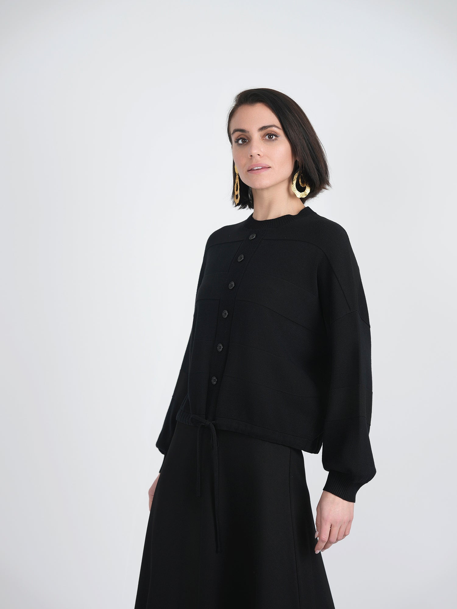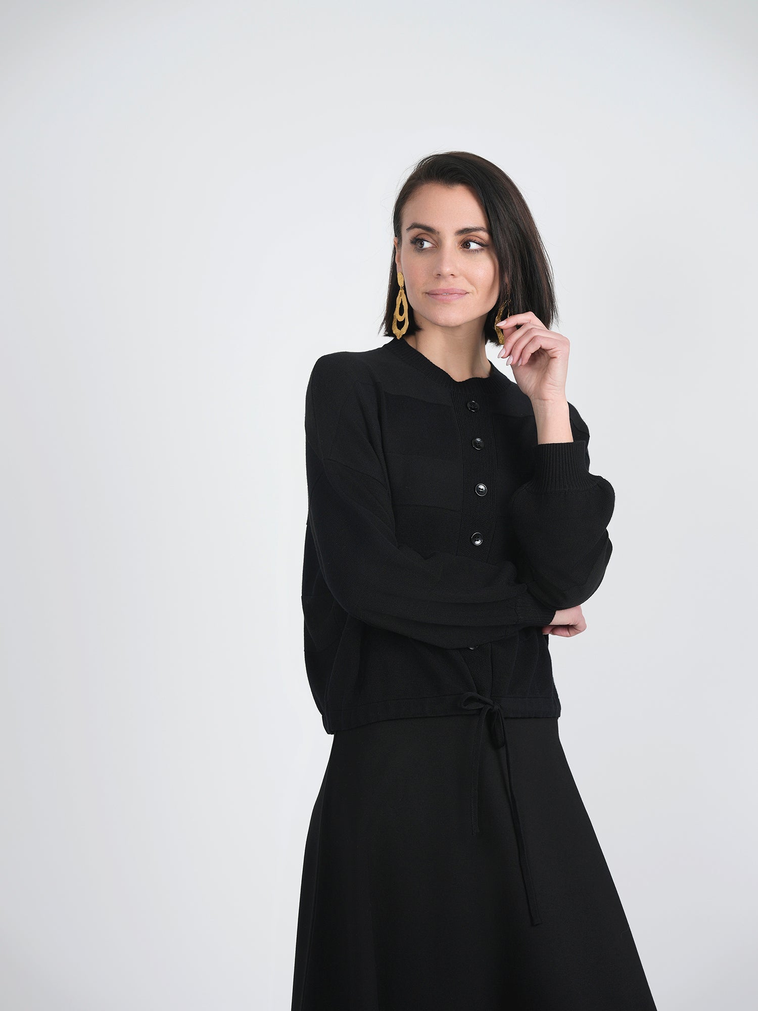 •LOOK: Don't you just love it when you can throw something on and not worry? Here is one of those sweaters that looks great the minute you put it on. Pull over style with faux buttons down the placket. Drawstring at the hip. Long sleeves. Soft knit fabric with a cool play between different textures creating a hi-lo shading effect. Mock turtleneck, raglan sleeves. Total casual comfort in a mod, fashionable way. Pair this with leggings, denim or throw this over a jumper for a fun look. Layering jewelry is huge this season and this is a great top to show off your creative side. It's versatile, fun and and right on trend.