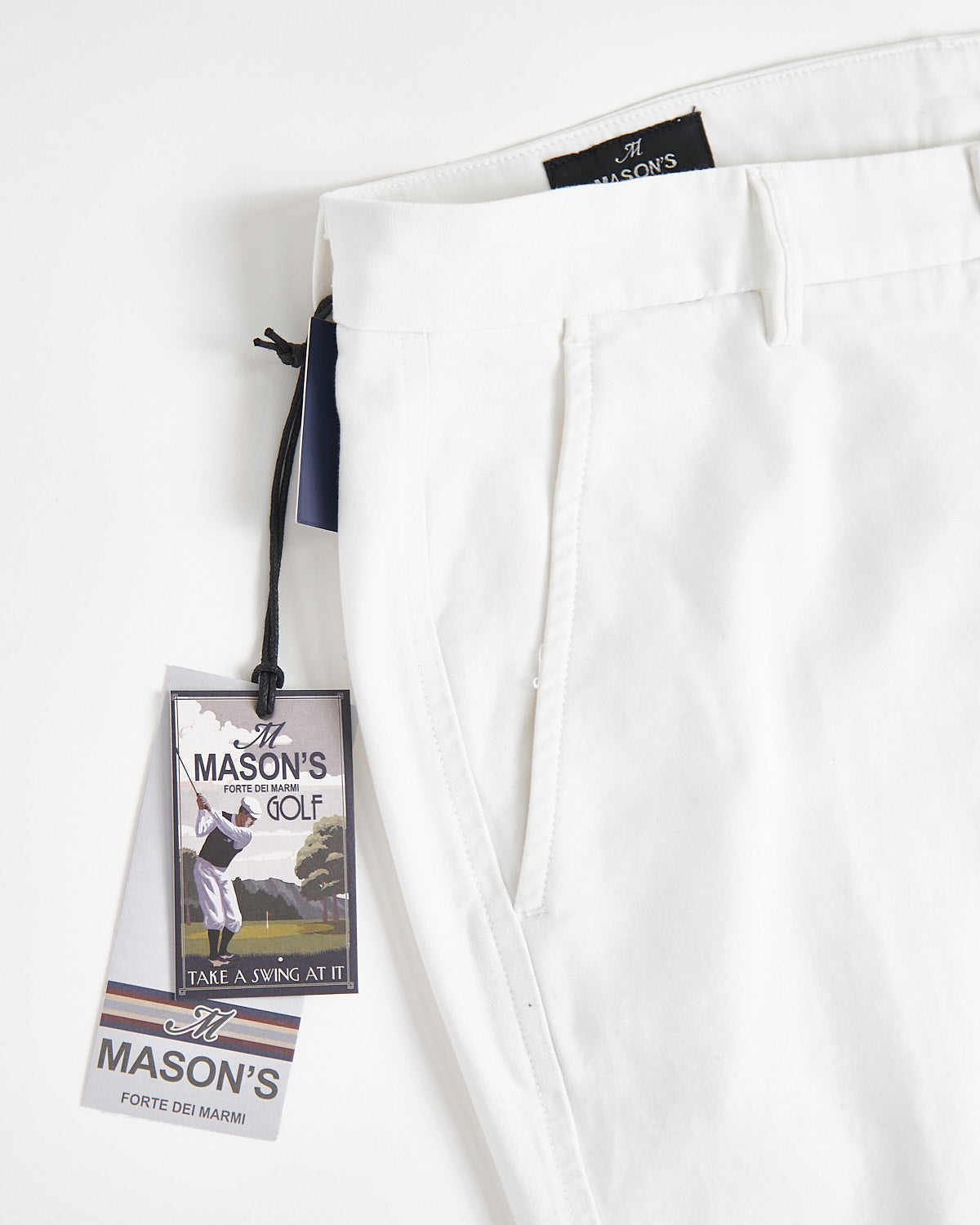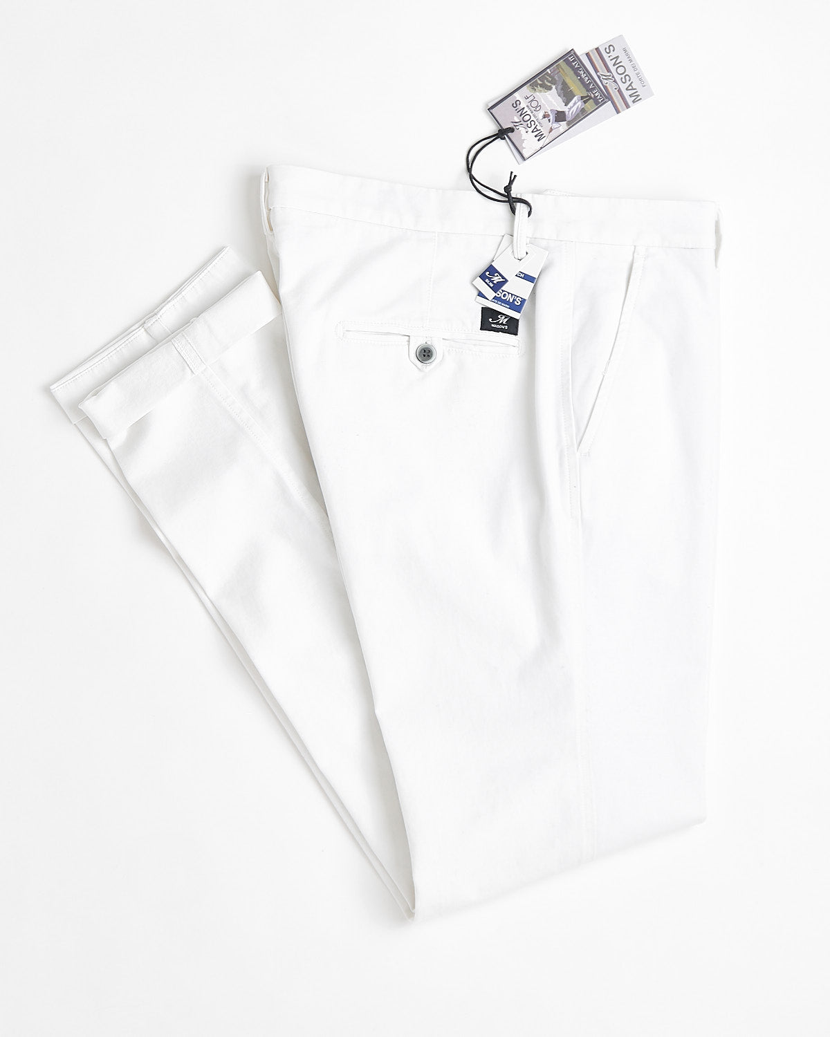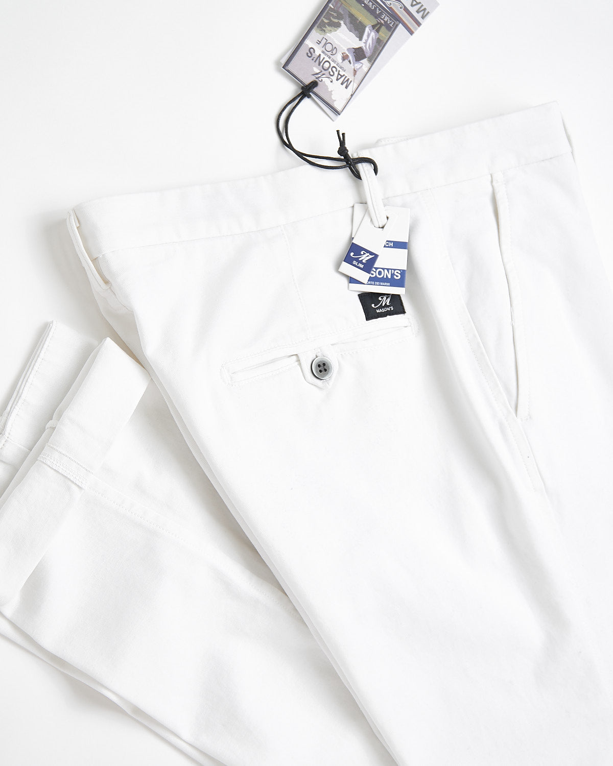 Introducing Mason's Torino Jersey Pants - the perfect combination of Italian style, practicality, and premium craftsmanship. Made from high stretch fabric, these white pants offer a slim, contemporary fit for both comfort and style. Great for a day at the beach or a summer night out with friends. Contact us for specific measurements.