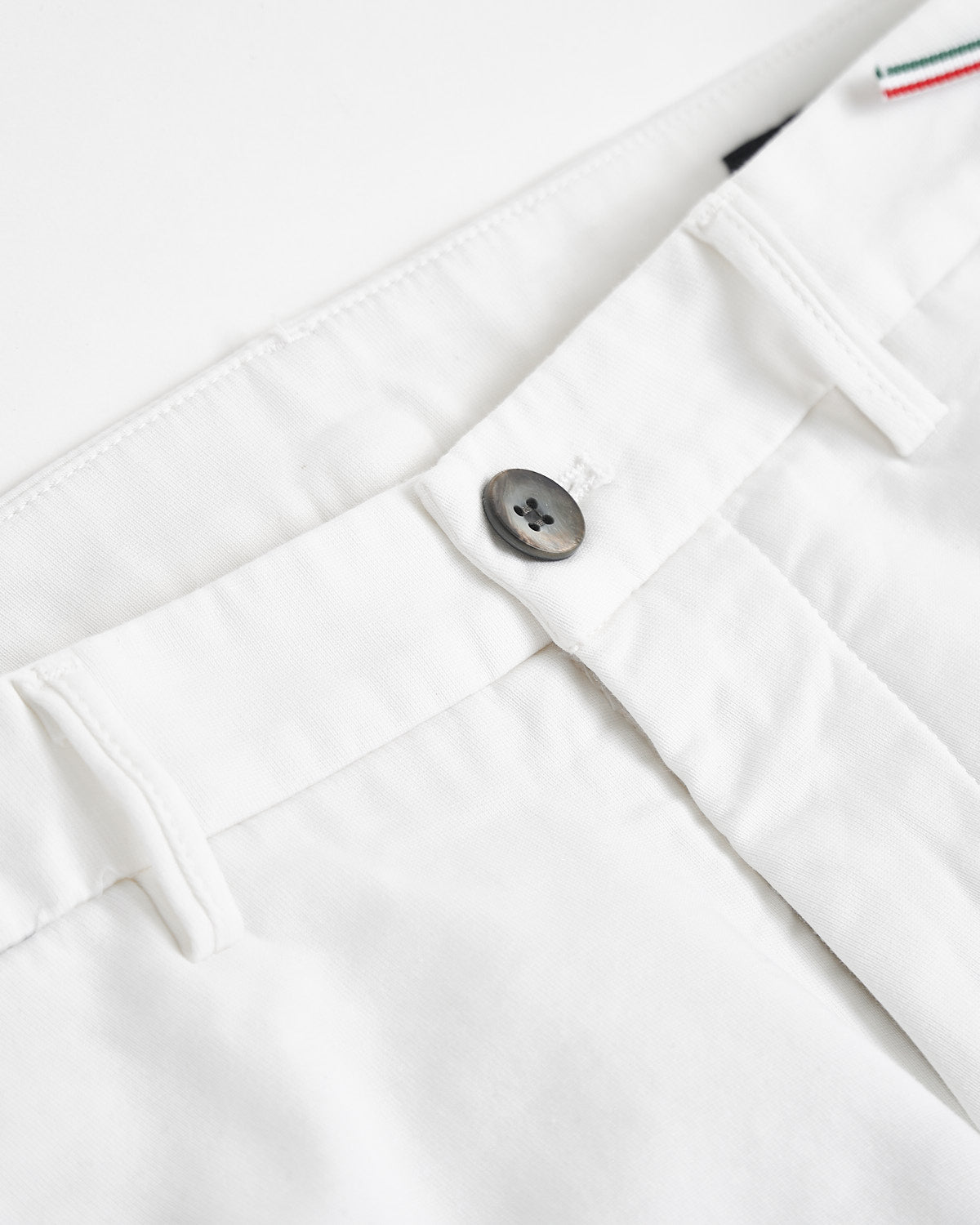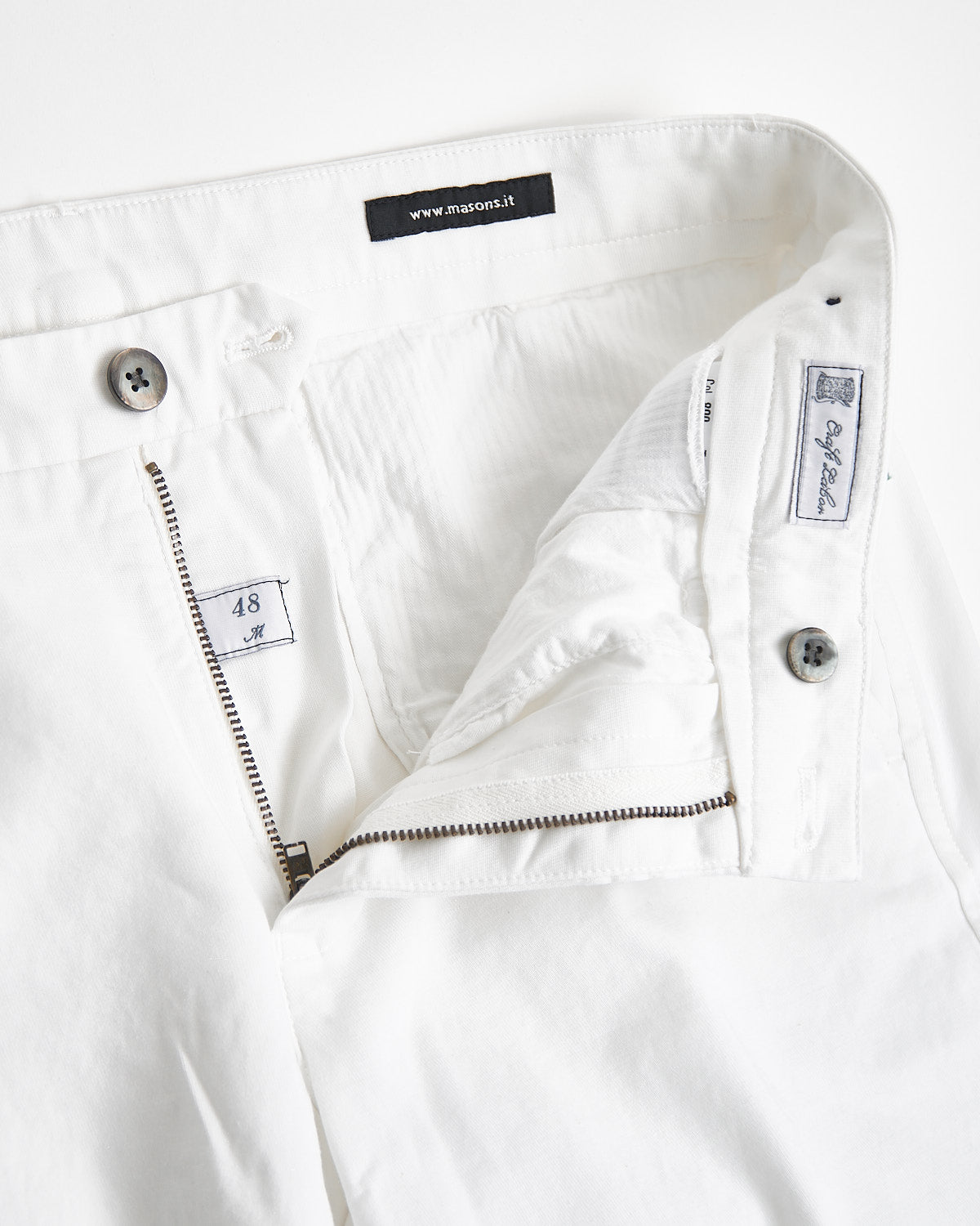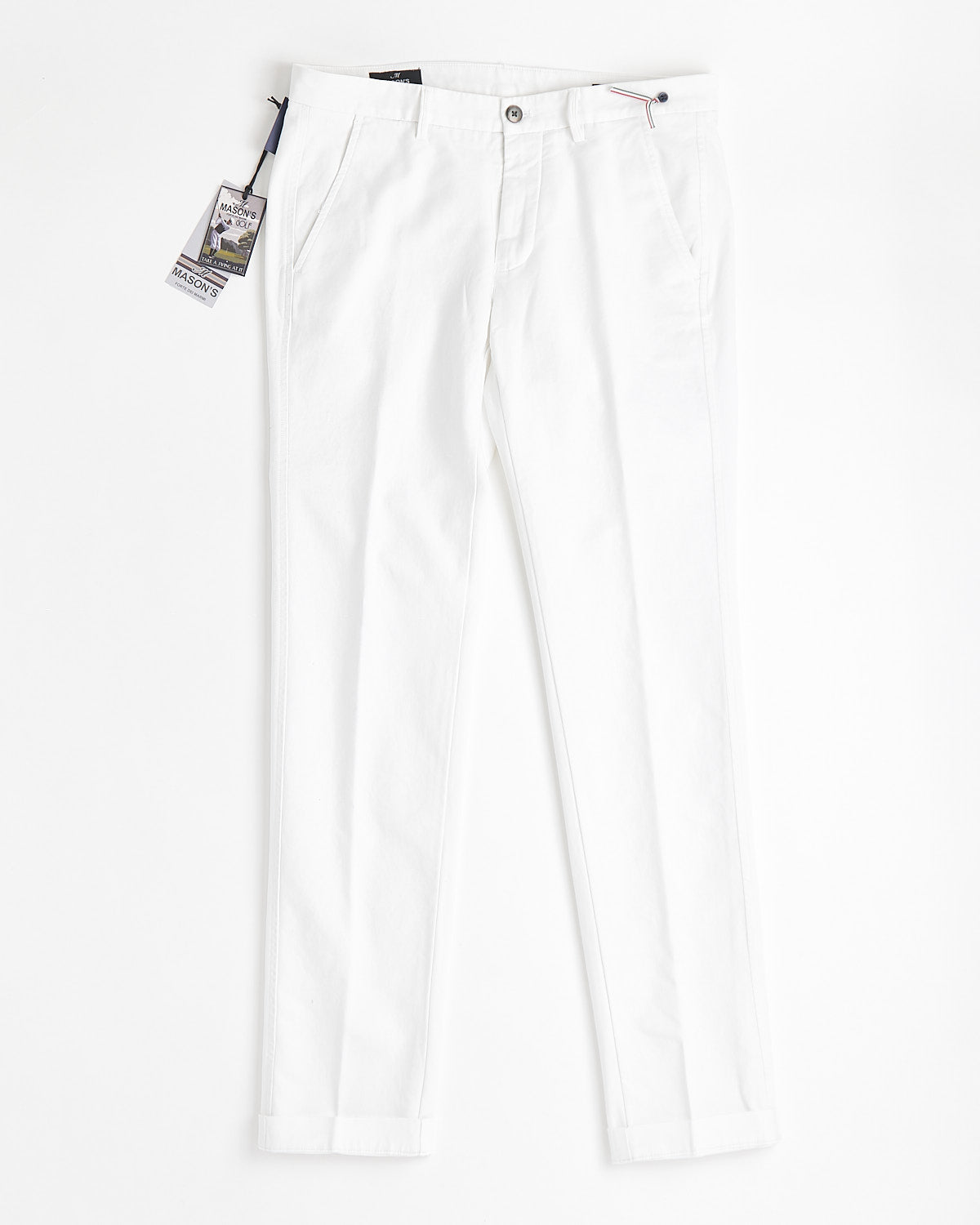 Introducing Mason's Torino Jersey Pants - the perfect combination of Italian style, practicality, and premium craftsmanship. Made from high stretch fabric, these white pants offer a slim, contemporary fit for both comfort and style. Great for a day at the beach or a summer night out with friends. Contact us for specific measurements.