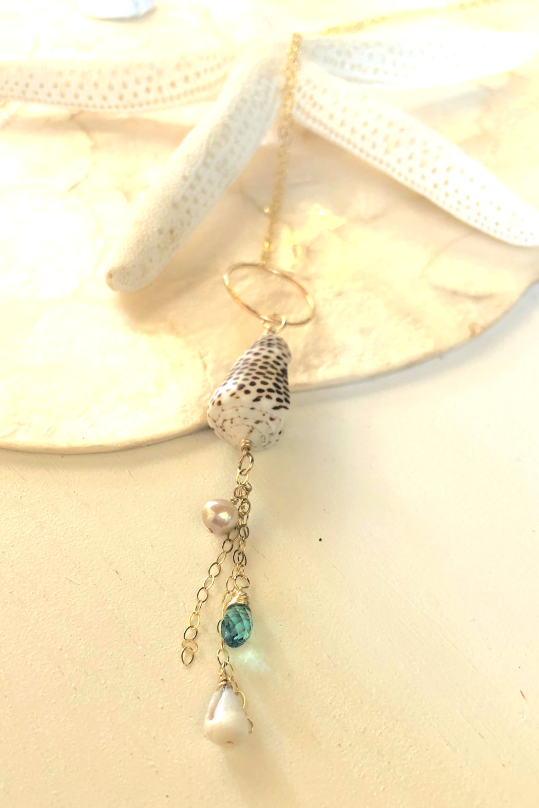 Maui Shell Necklace - 14K Gold Filled - 40". Designed & made in upcountry Maui. One of a kind. Long necklace that can slip over your head. Includes an "O" link, a Maui cone shell, 2 tiny dangling shells, 1 swarovski crystal. A beautiful Maui keepsake or give as a special gift.