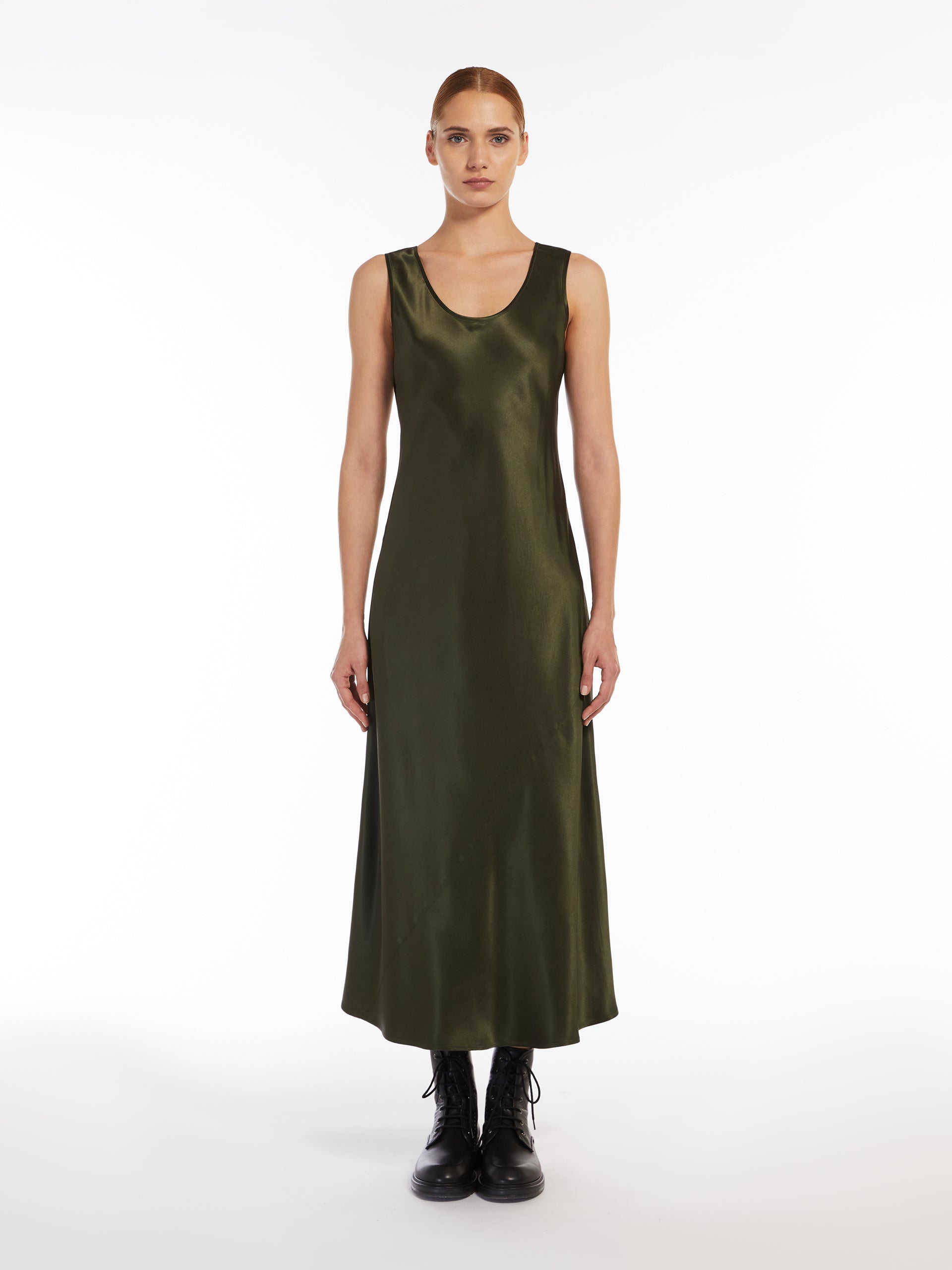 Sleeveless jersey dress with a wide neckline. The diagonal cut on both the front and back exalts the flared fit, vintage-effect texture. Length: 135 cm.