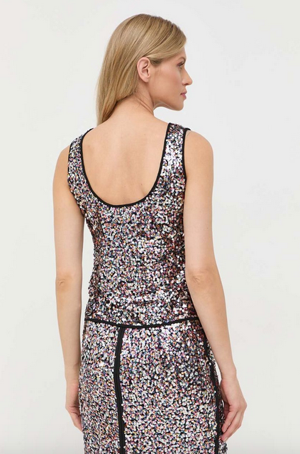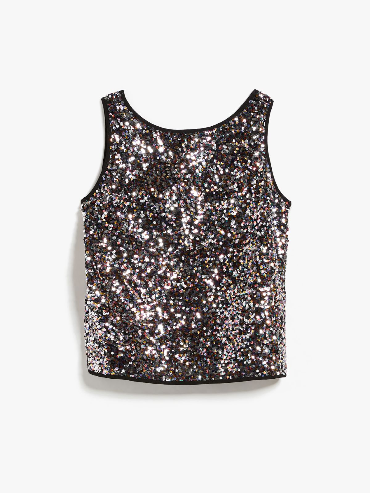 Sleeveless Didi top by Max Mara Weekend in lightweight jersey embroidered all over with micro-sequins. Straight-cut style with boat neck on the front and deep back.