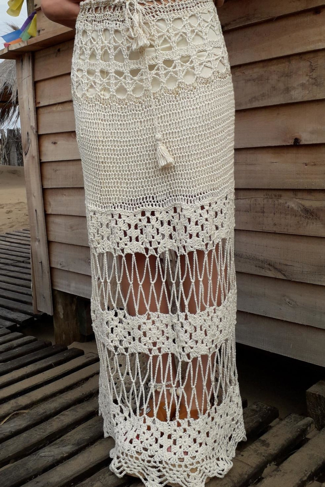 Crochet hand made skirt with coton and silk with details of brigh gold lurex . design trendy boho chic . eco fashion limited edtion slow fashion size small medium THIS SKIRT IS FOR 170 CM OF HEIGHT WAIST 65 CM T 95 CM HIPS color natural cotton