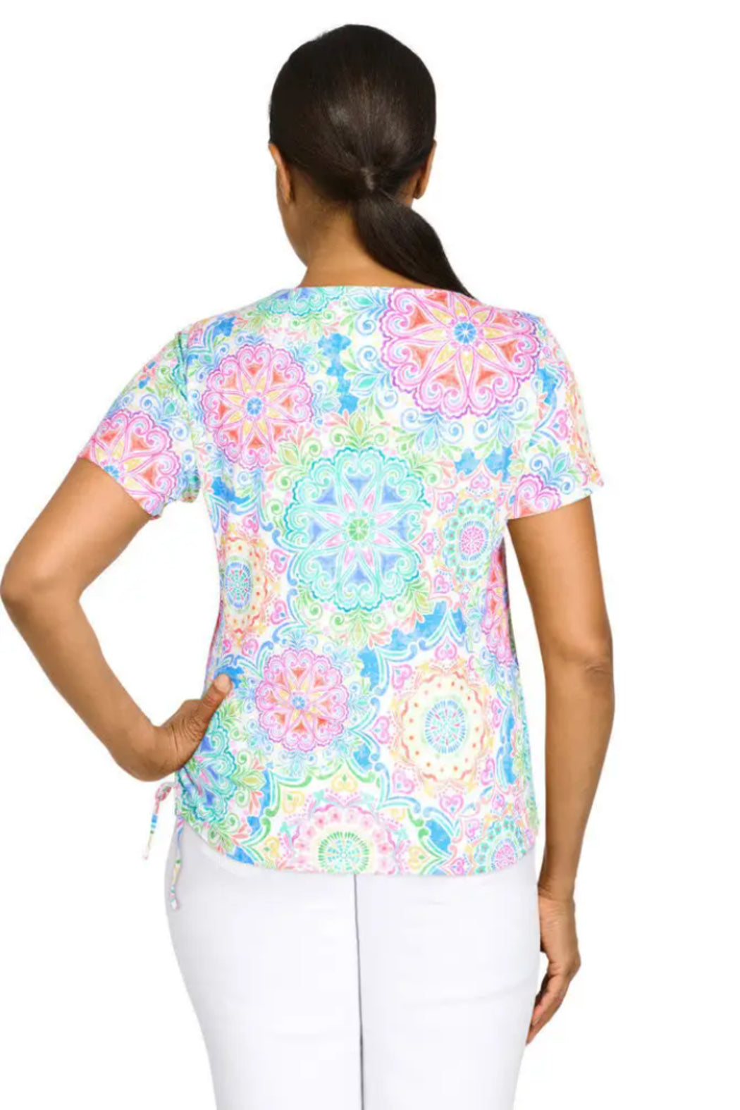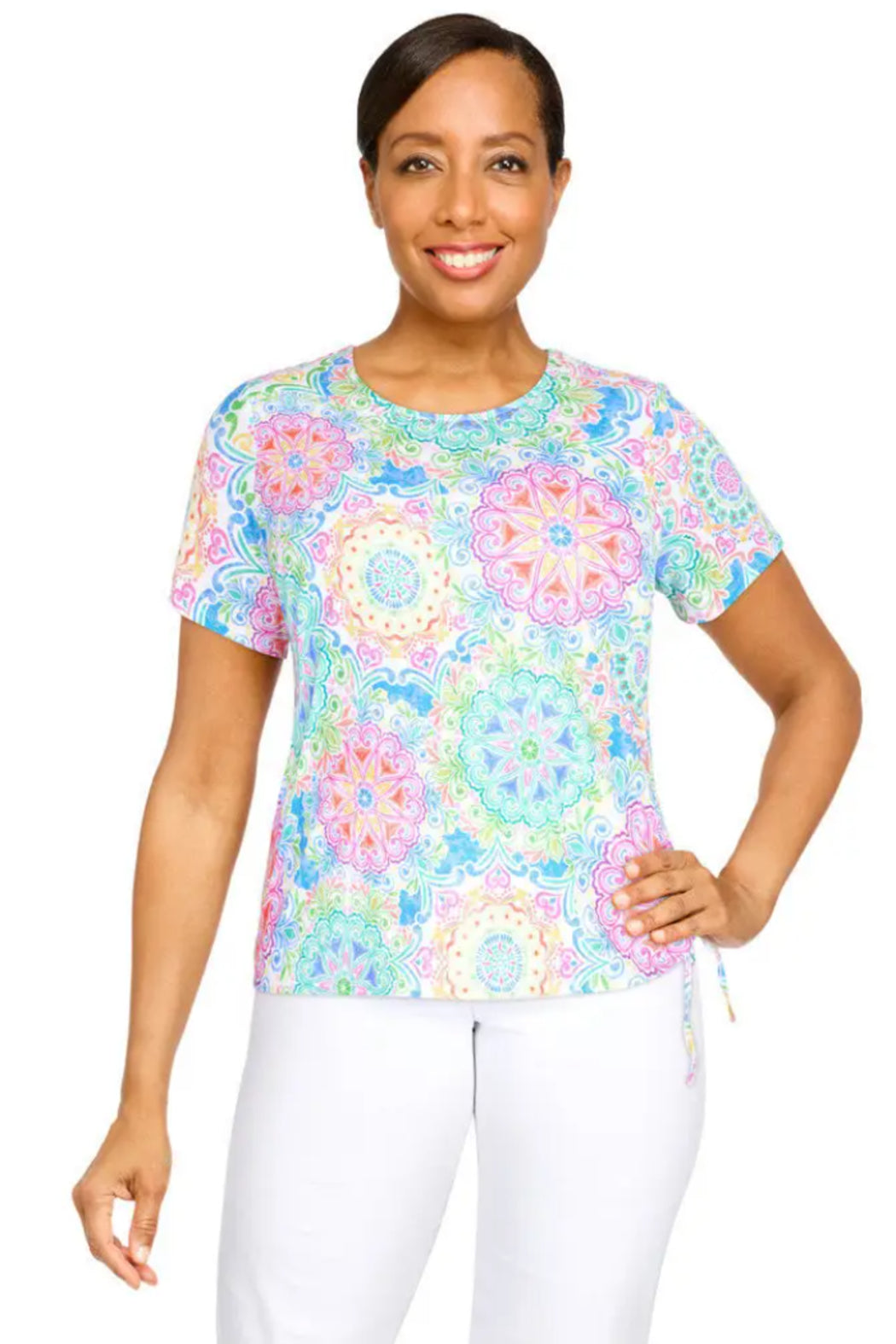 Brighten up the room with our dazzling medallion print! This knit tee features short sleeves, crew neck and drawstring ruched detail on the side.
