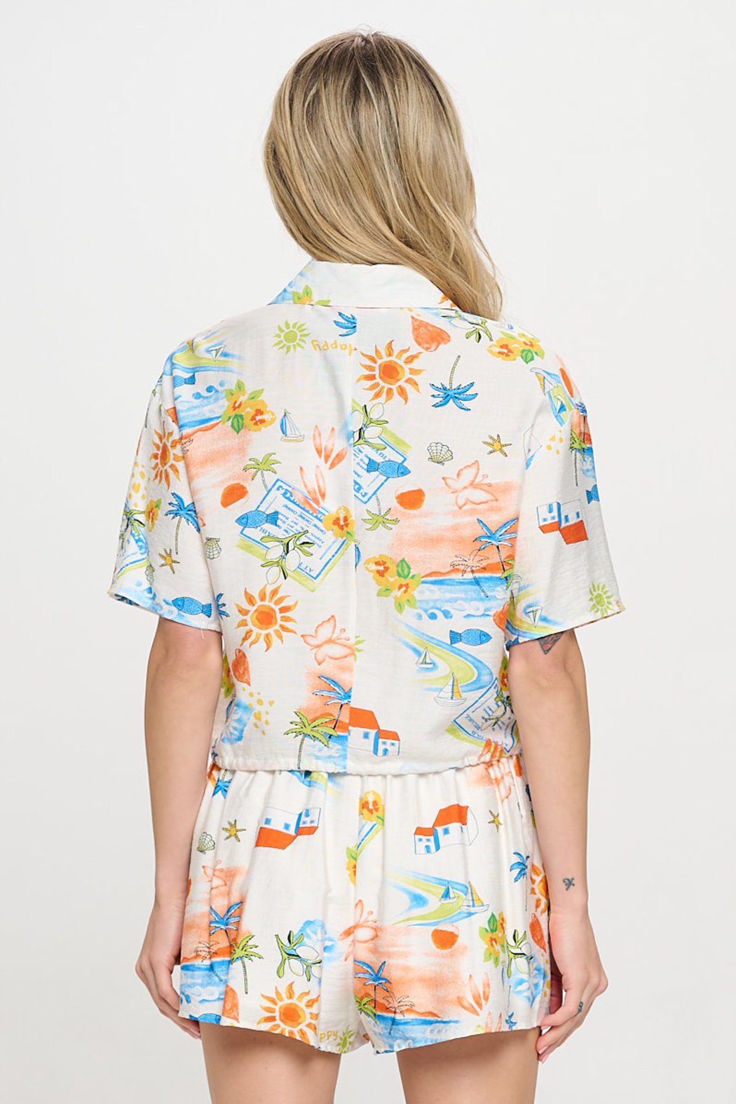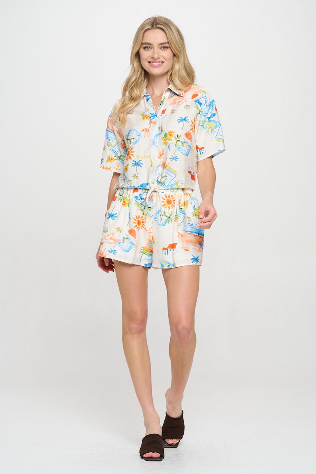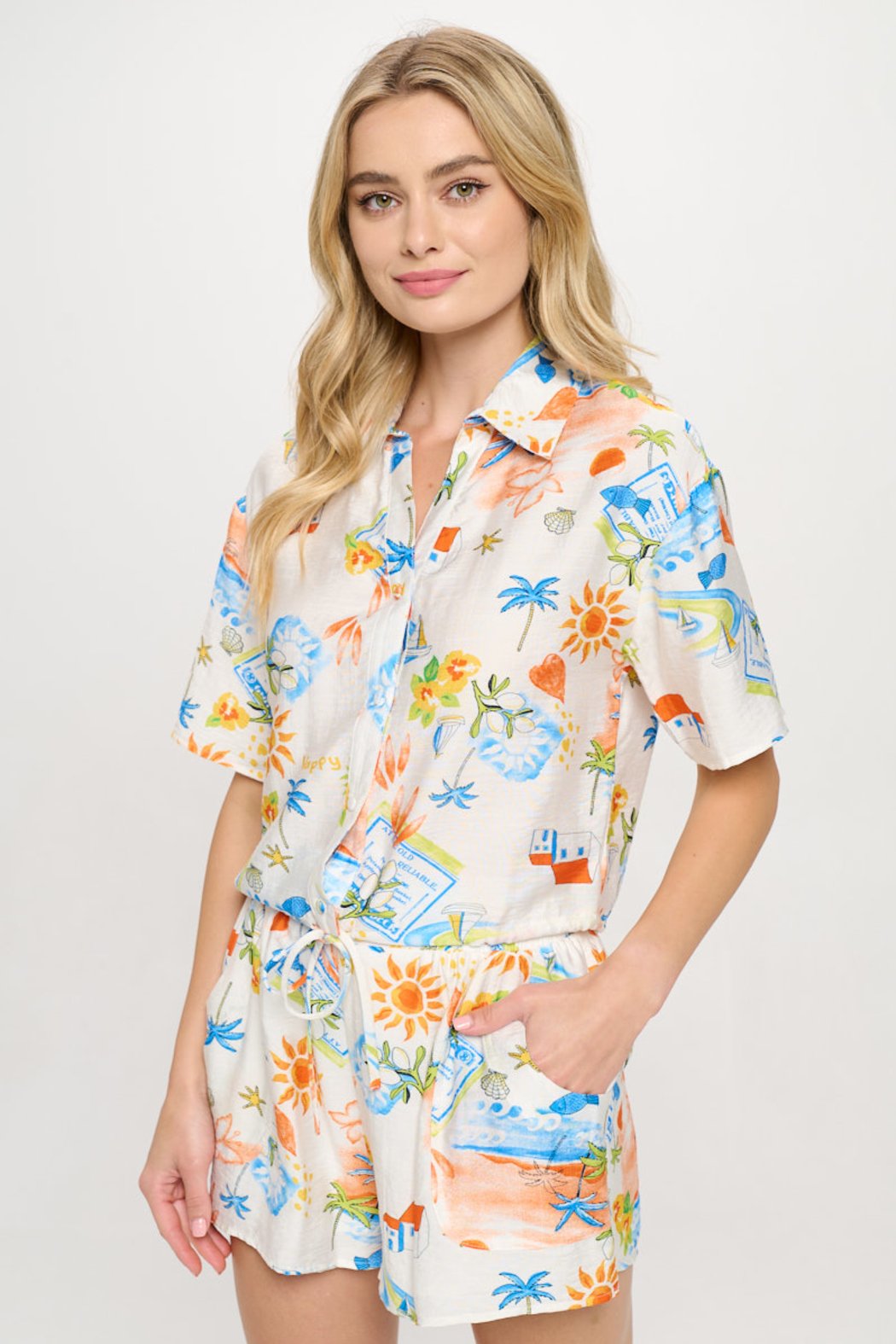 Sun-drenched and statement-ready, the Mediterranean Daydream Set is your effortless outfit for warm-weather wanderlust. This playful pairing features a relaxed button-down shirt with breezy short sleeves, and matching high-waisted drawstring shorts that move with ease. Covered in a hand-drawn, coastal-inspired print, it brings a burst of color and charm that captures the carefree spirit of Santorini.