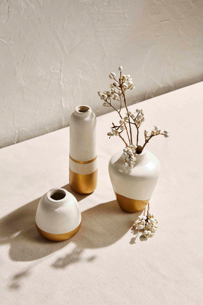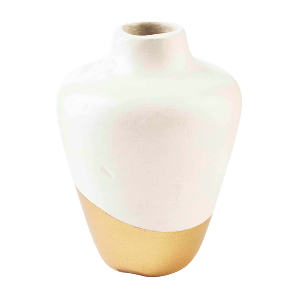 Our Medium Gold Bud Vase is perfect for your favorite beautiful blossoms. The papier-mâche vase features hand-painted details. This vase is a perfectly seasonless piece that can showcase florals for every season. We recommend adding your favorite dried florals or pampas grass to this vase.