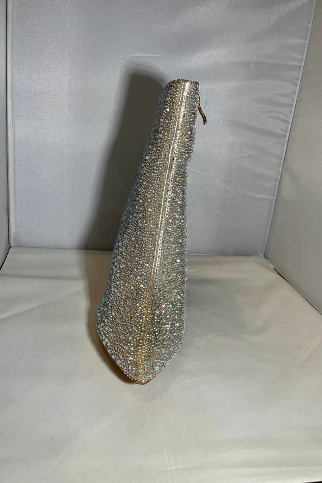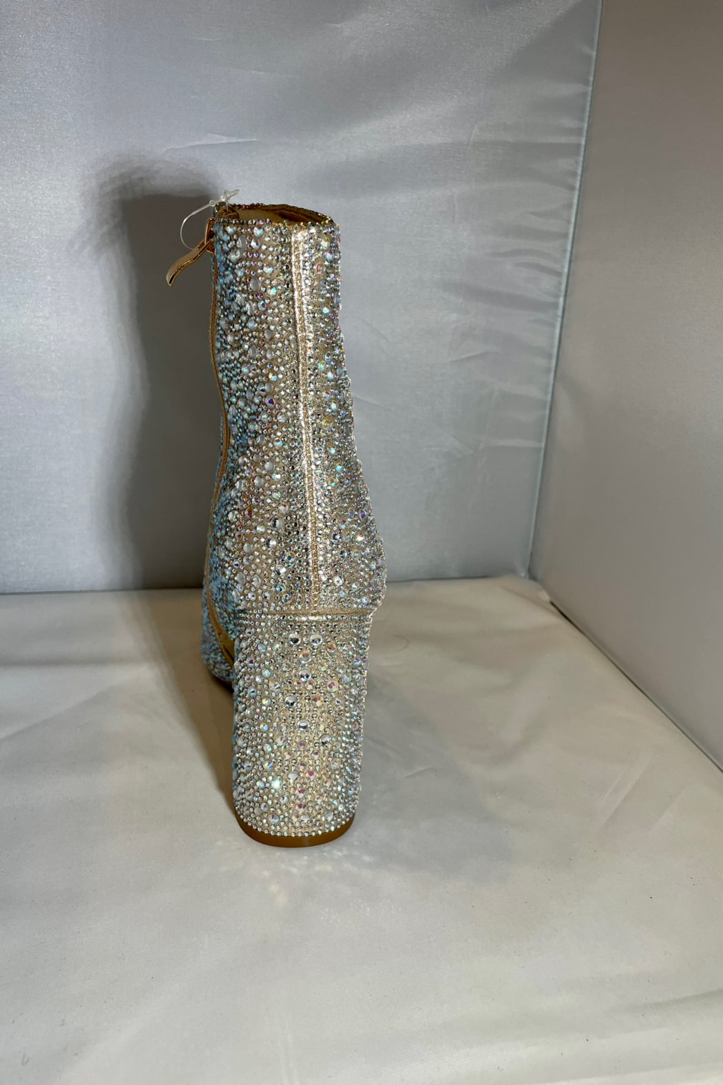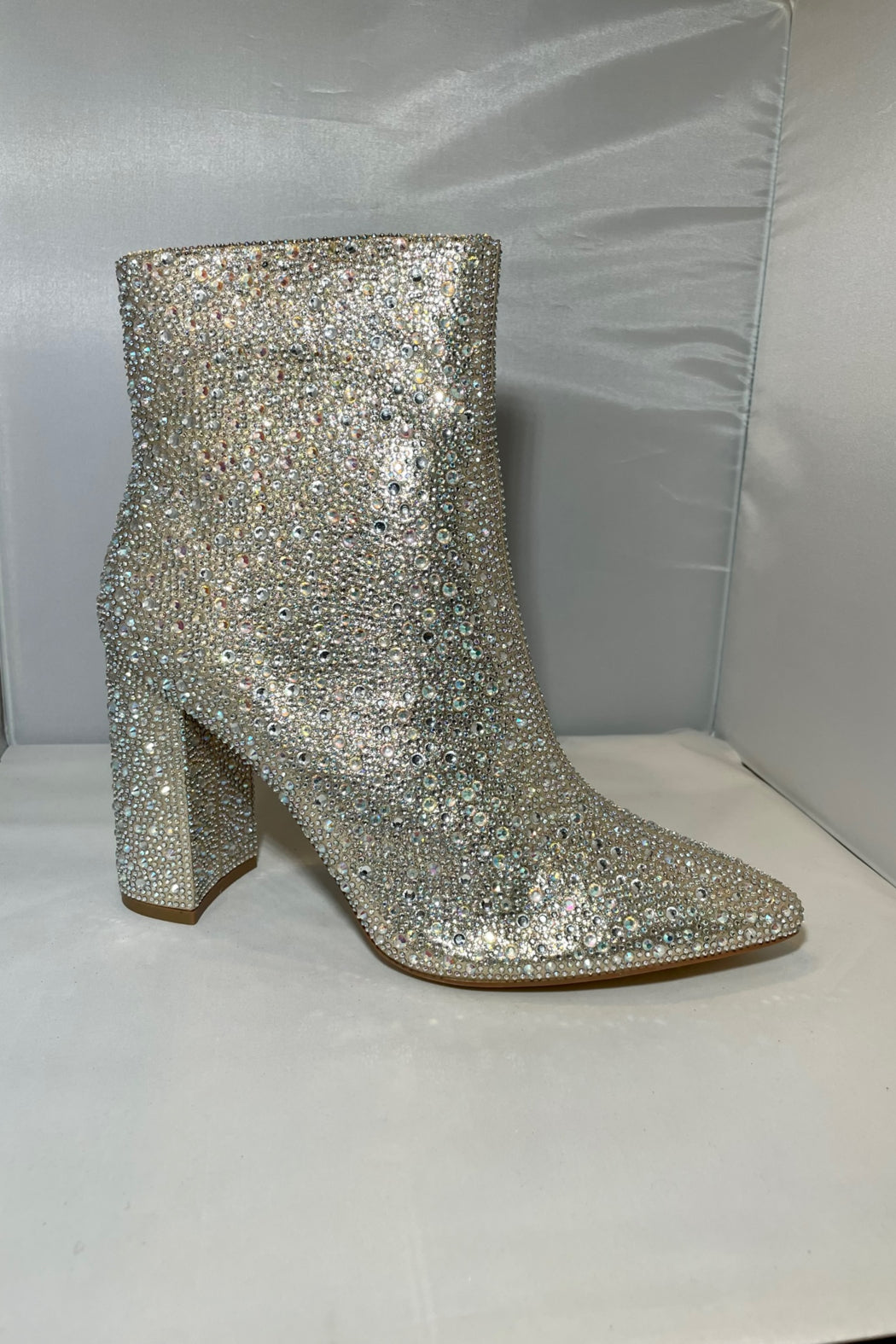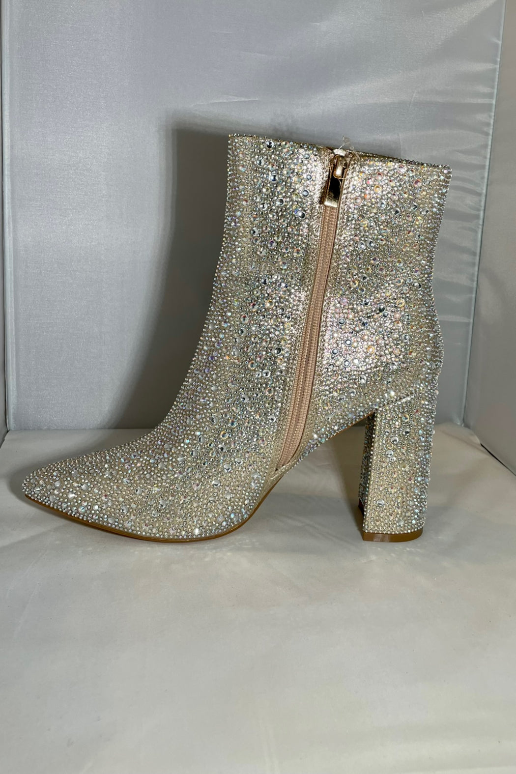 How cute is this bootie? It is completely covered in rhinestones with a nude shimmer color base. It has a side zipper to easily put them on and take them off. They do run a little narrow in the toes so if you are in between sizes we would recommend sizing up so they aren't tight in the toes. The heel height 4" tall.