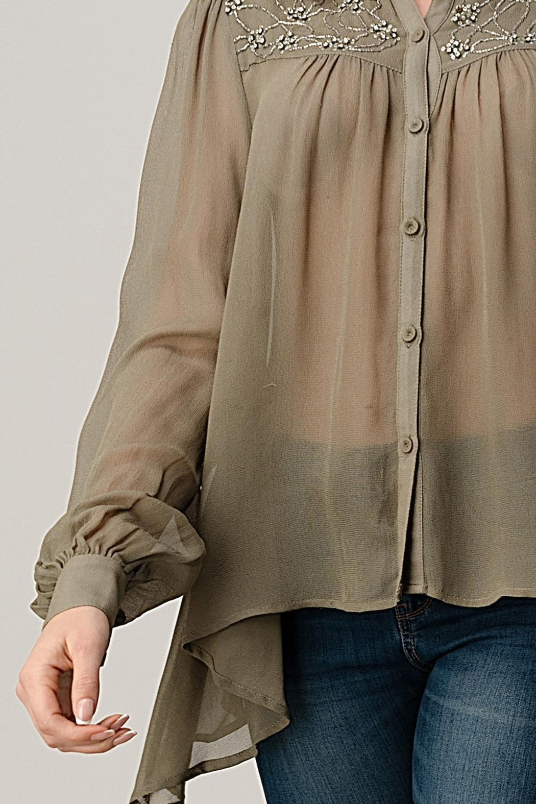 Beaded Jewel Trim Button Front High-Low Hem Shirt Top With Long Sleeves In Georgette