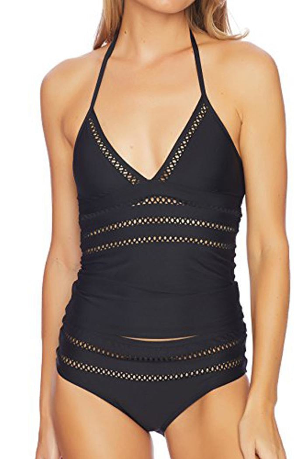 Black Triangle Tankini with mesh front details and lace up back detail. Features Halter neck tie and removable cup padding.