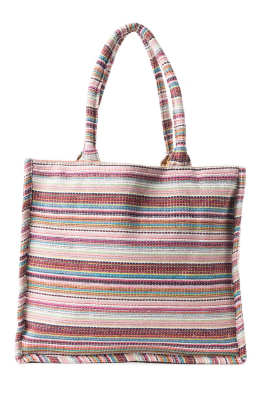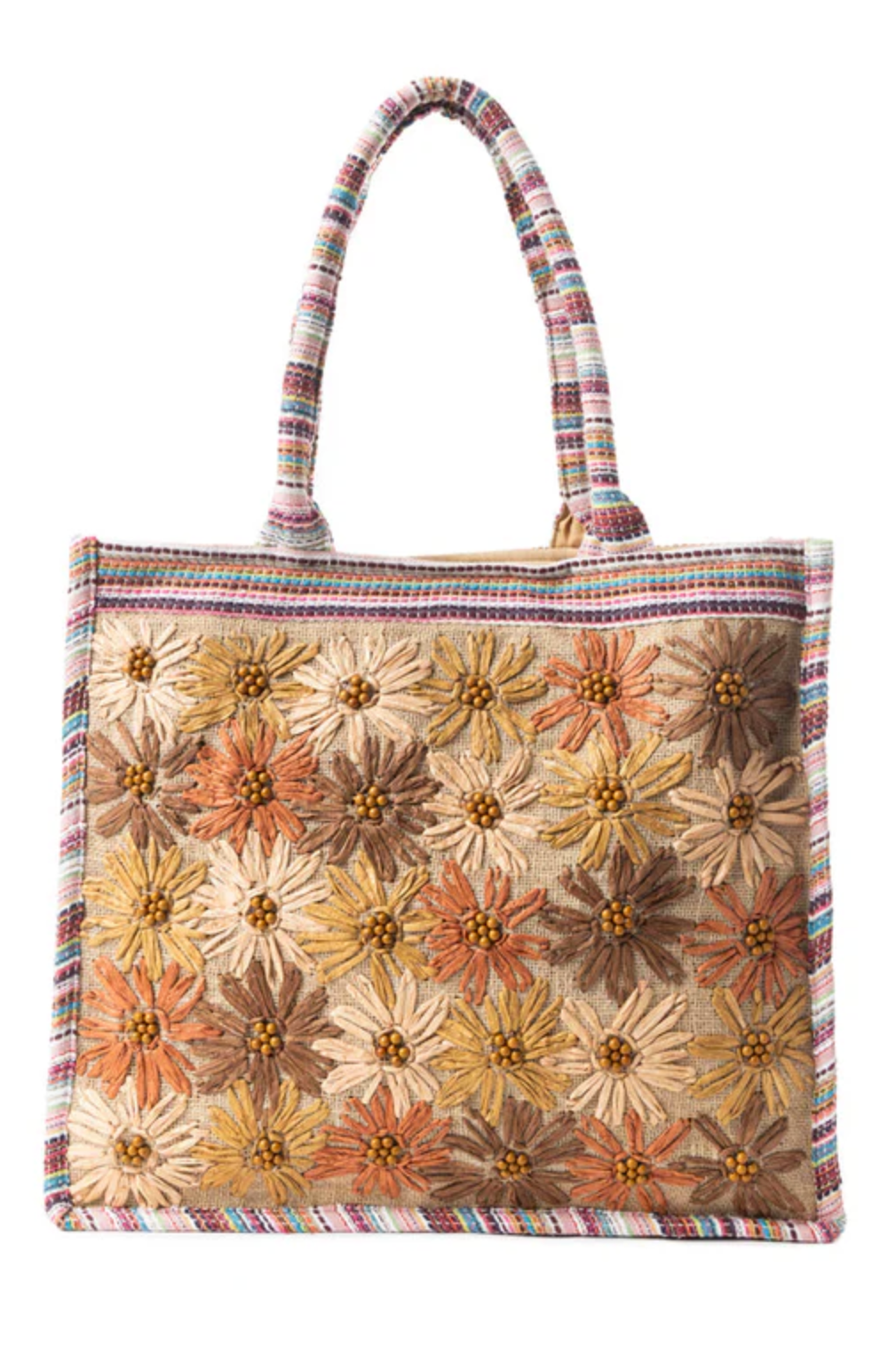 Discover two looks in one with this two sided boho tote. One side features intricately embroidered sunflowers in earthy hues, while the reverse showcases charming multicolor stripes. Handcrafted with care, this versatile carryall brings artisanal flair to every outfit, from beach days to market mornings.