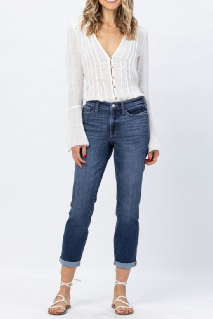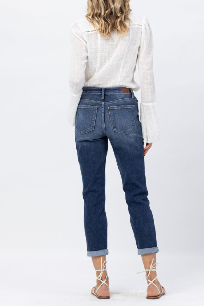 Mid-rise dark wash jean. Soft and stretchy. Five pocket design. Fuller fit through hips and thighs with tapered fit to the ankle. Refer to measurements for your perfect fit. Rise: 10". Inseam: 28". See photos for size chart.
