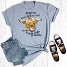 This Mika I'm Not the Sweet Girl Next Door Graphic T-Shirt is the perfect way to show off your fun, original side! Featuring an adorable Highland cow graphic and a funny 'crazy heifer' message, this comfy tee is sure to draw all the right kinds of smiles.