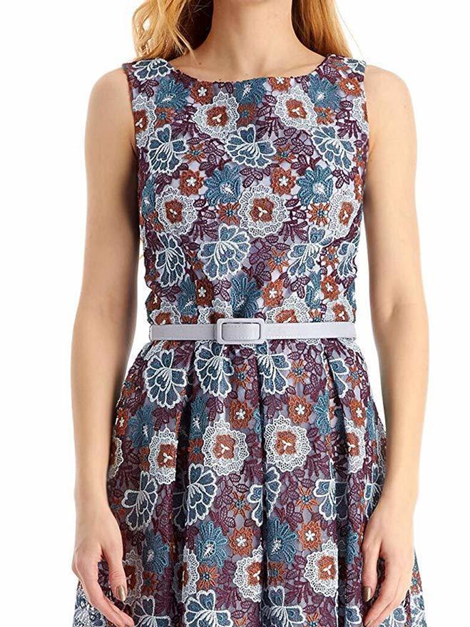 Sleeveless floral lace multi-colored A-line dress with hidden zipper back, and wasted pleats on skirt. Dry Clean Only