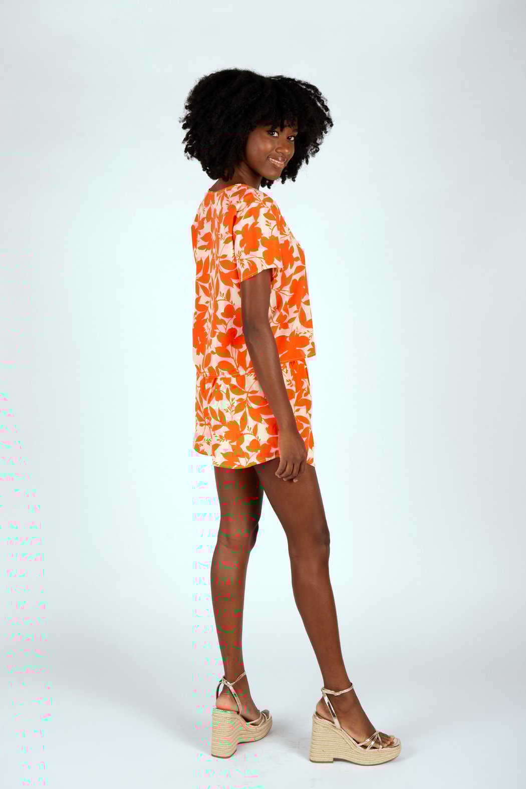 The top boasts a flattering V-neckline and short sleeves, providing a relaxed and airy feel. The high-waisted shorts feature an elastic waistband for a snug yet comfortable fit, ensuring ease of movement throughout the day. The classic black color adds a touch of sophistication, making this set an essential part of your summer wardrobe.