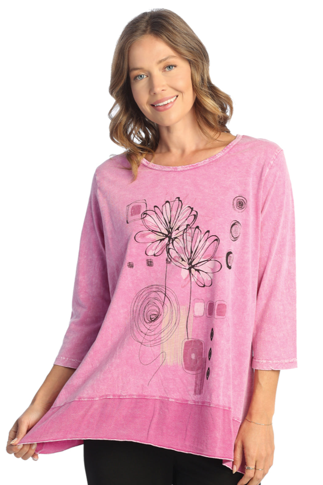 This mineral washed tunic features 3/4 sleeves, rounded neckline, and slight shark bite hemline.