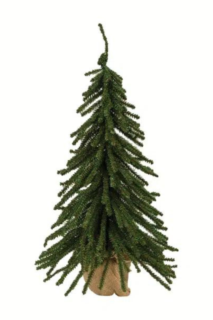 24" Mini Downswept Tree With Burlap Base is a tabletop tree with a burlap-wrapped weighted base and a metal wire trunk and branches. Tree has 229 adjustable plastic needles, and it looks great on an entryway console or used as a centerpiece. Measures 24" high by 4" in diameter.