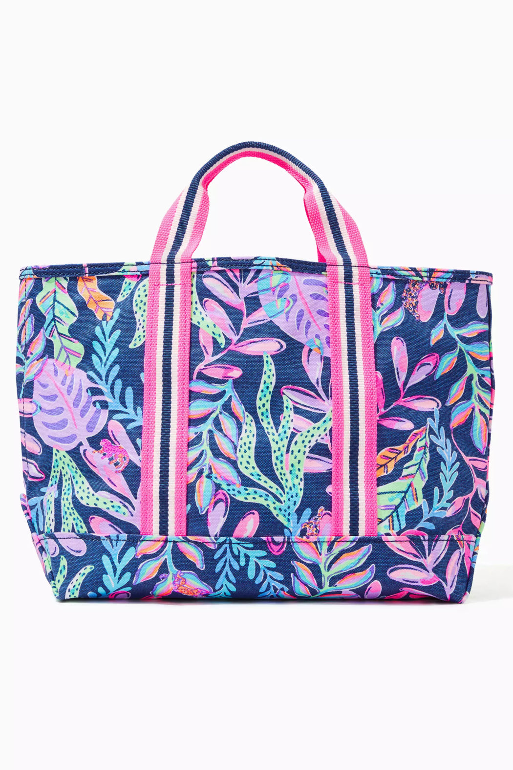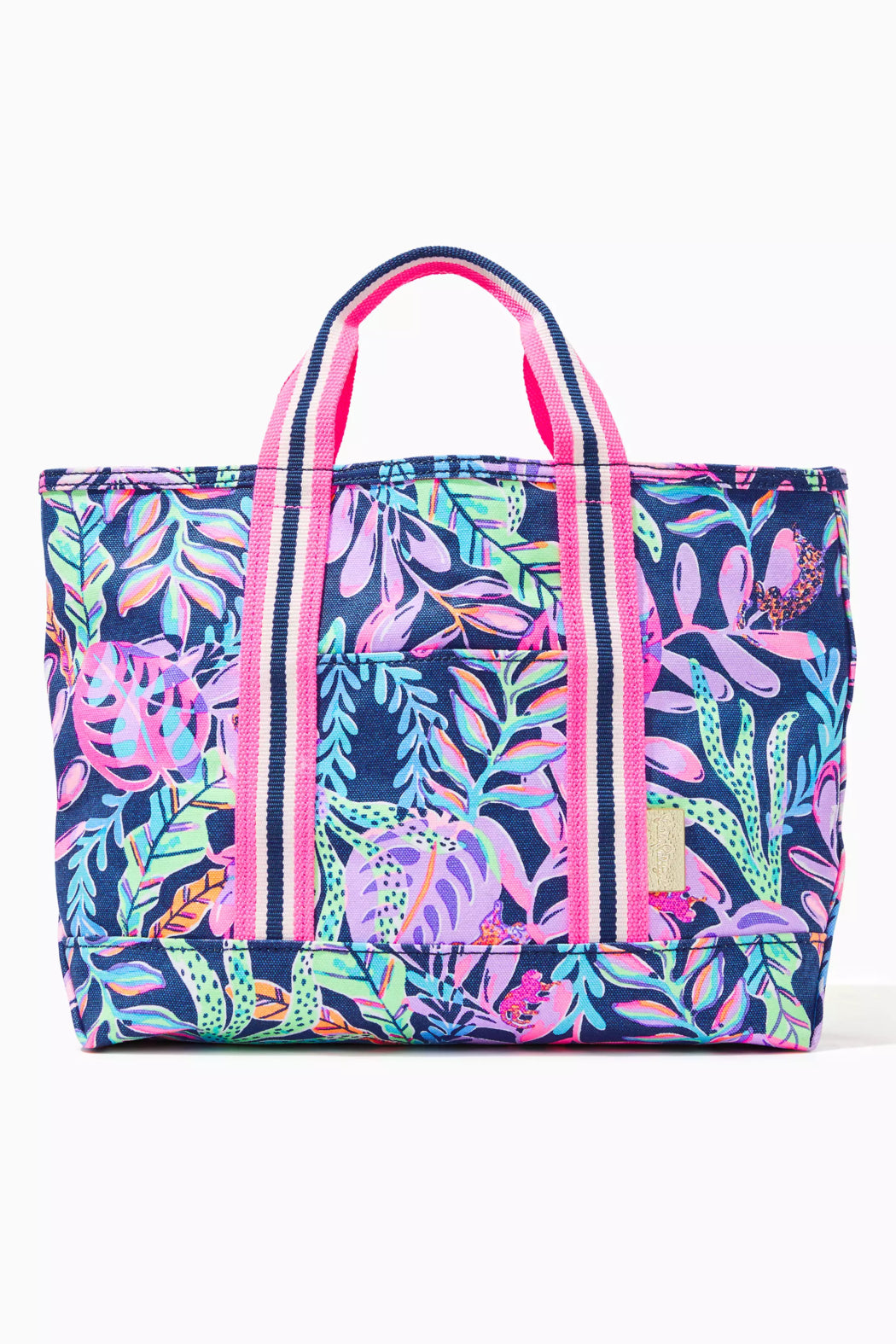 Mini printed zip top canvas beach tote with striped webbing detail.