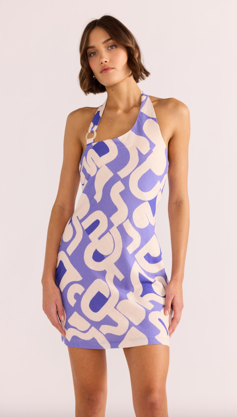 Discover effortless style and contemporary design with the MINKPINK Iris Asymmetric Mini Dress. Crafted from a breathable viscose-linen blend, this dress offers luxury and comfort in one. The striking blue-purple geometric print and unique asymmetric neckline with metal ring detail make this a standout silhouette. Perfect for any occasion, day or night.