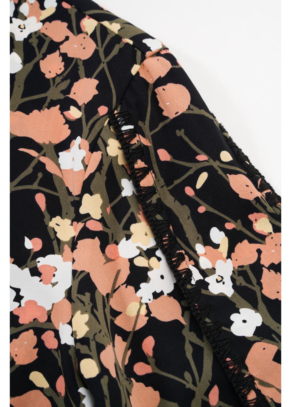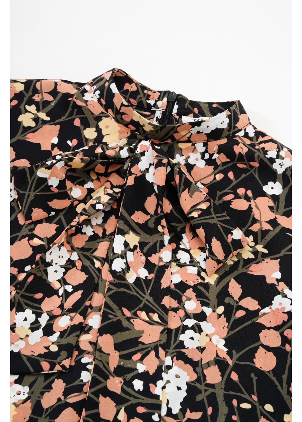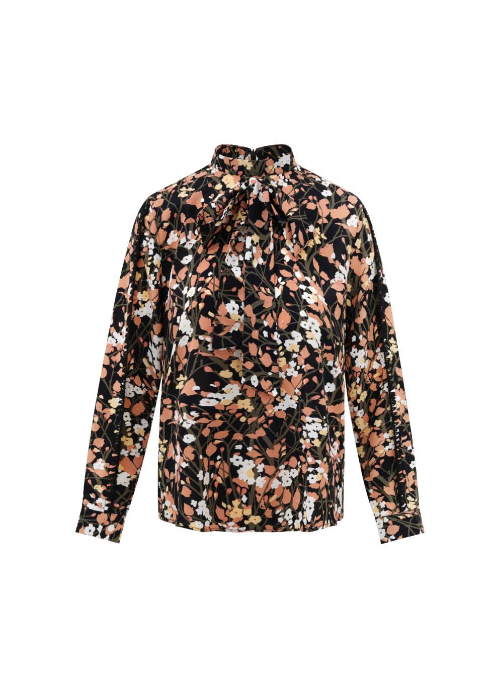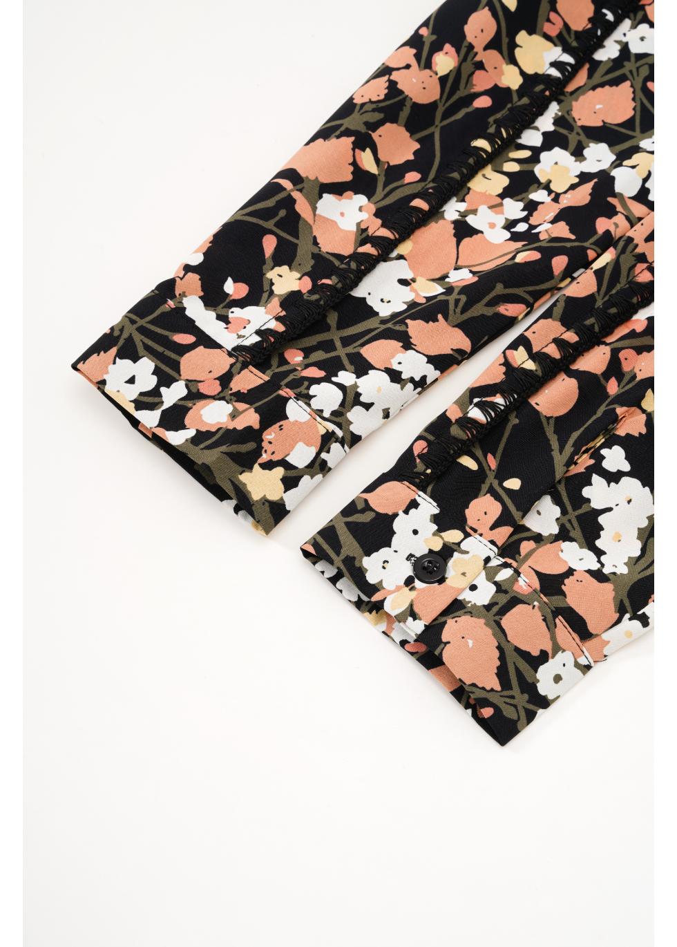 This charming blouse showcases a vibrant pattern with a mix of warm and neutral hues, ideal for infusing your outfit with a touch of spring regardless of the season. The standout feature is the cuffed sleeve with a smart front tie, adding a dash of elegance and contemporary flair.