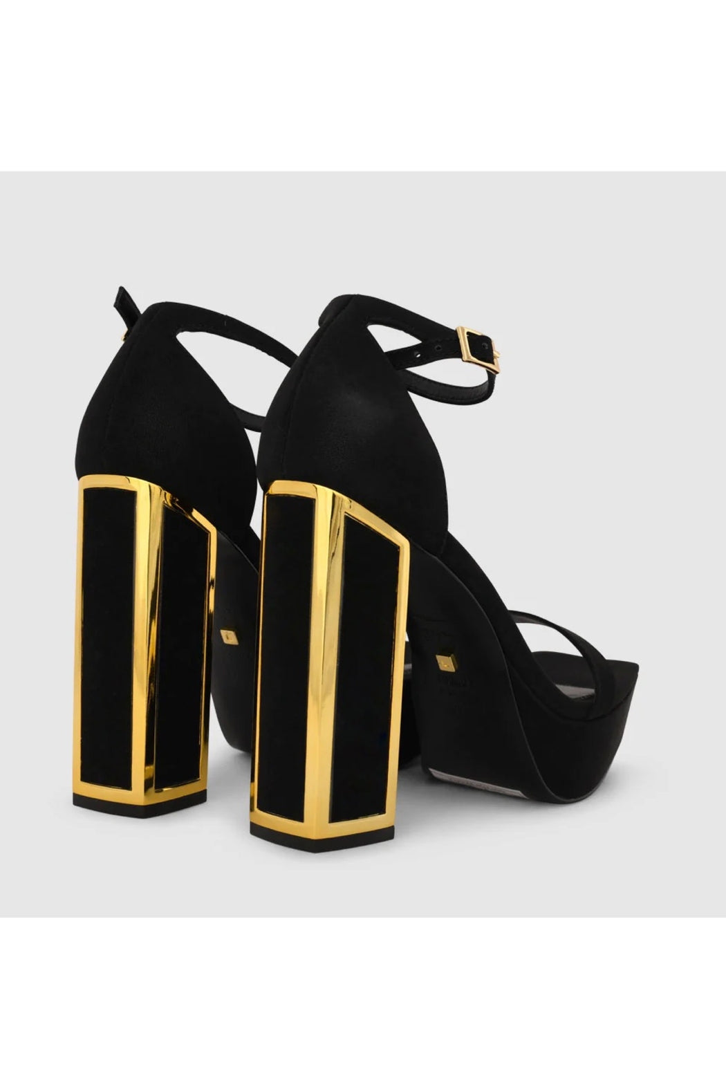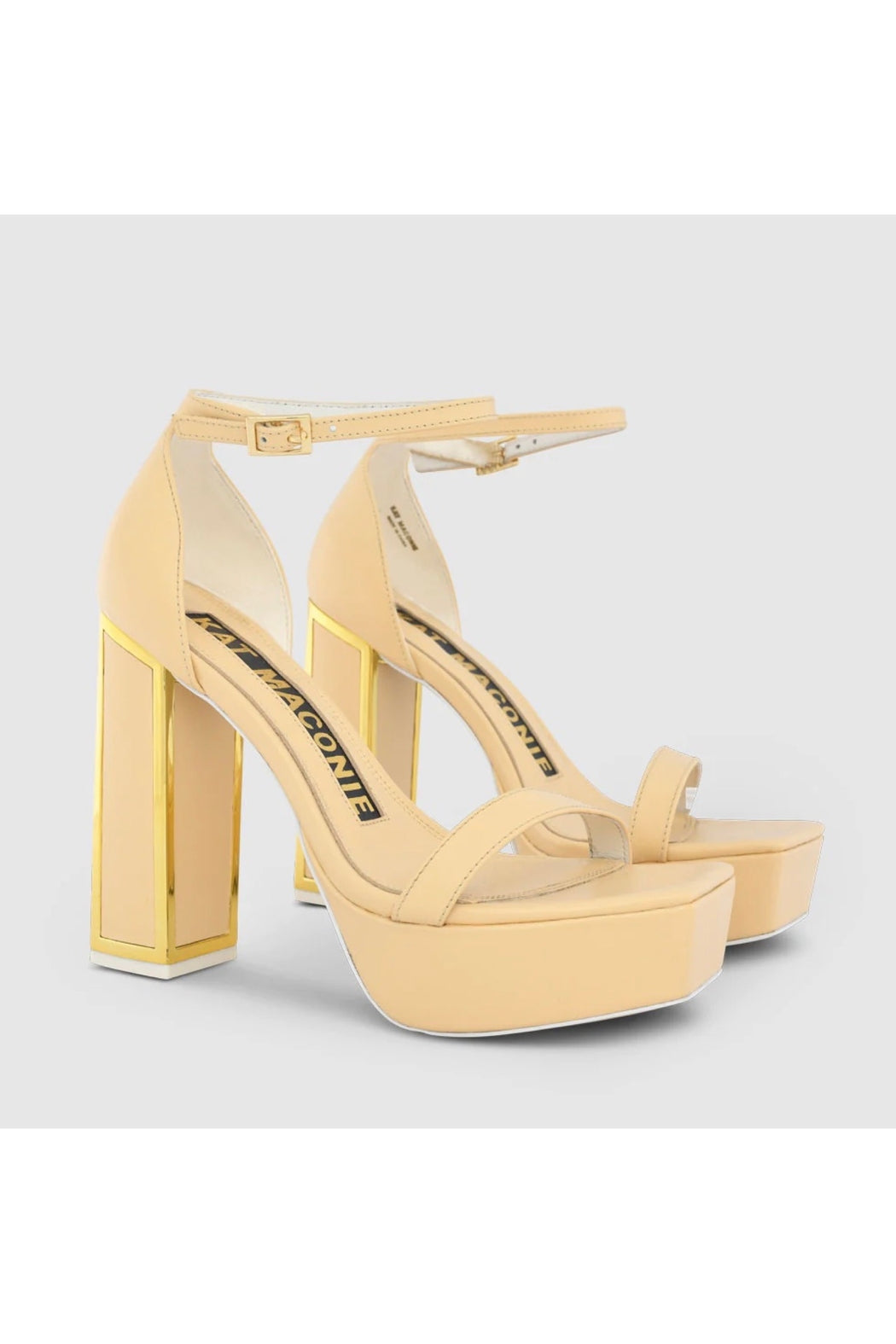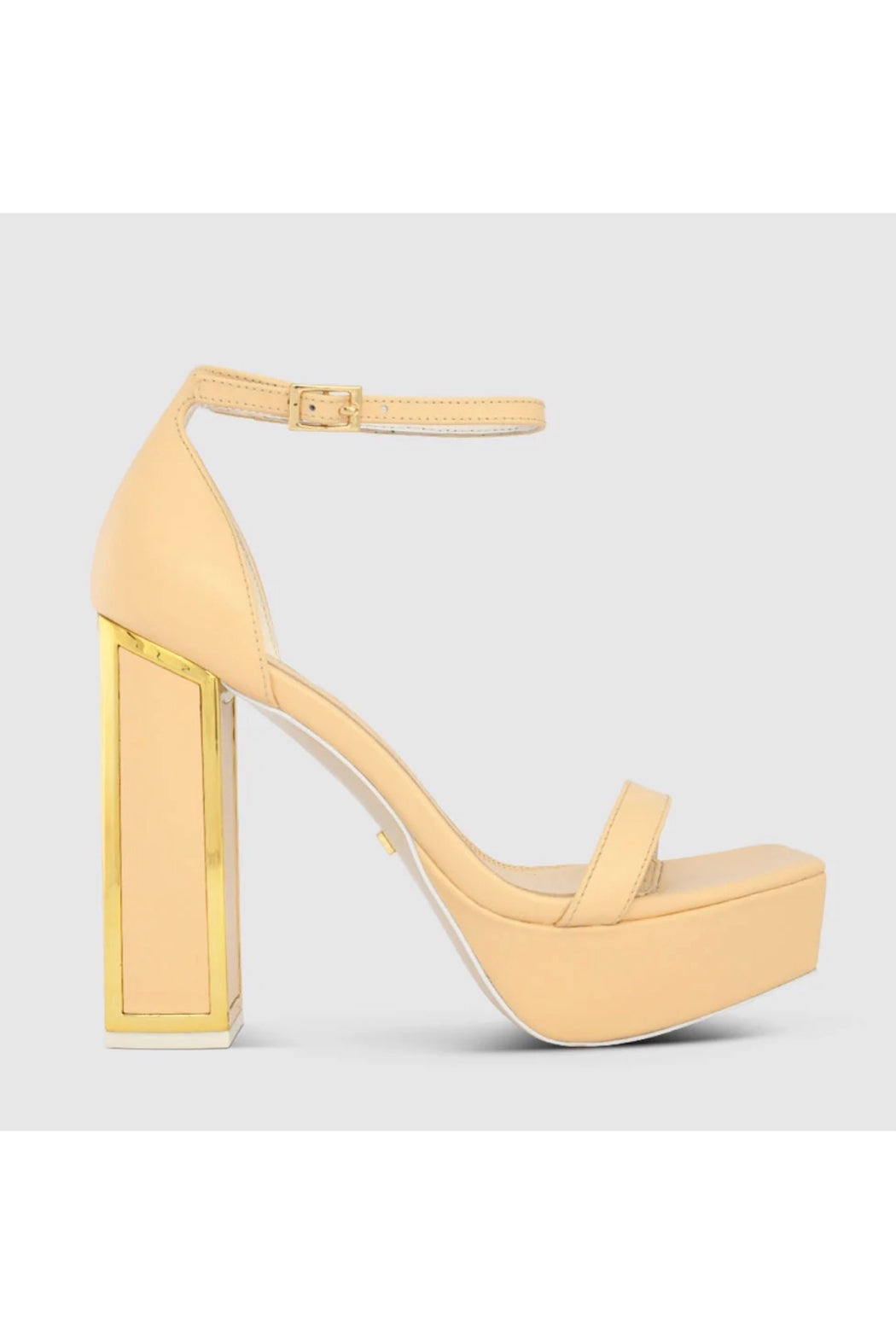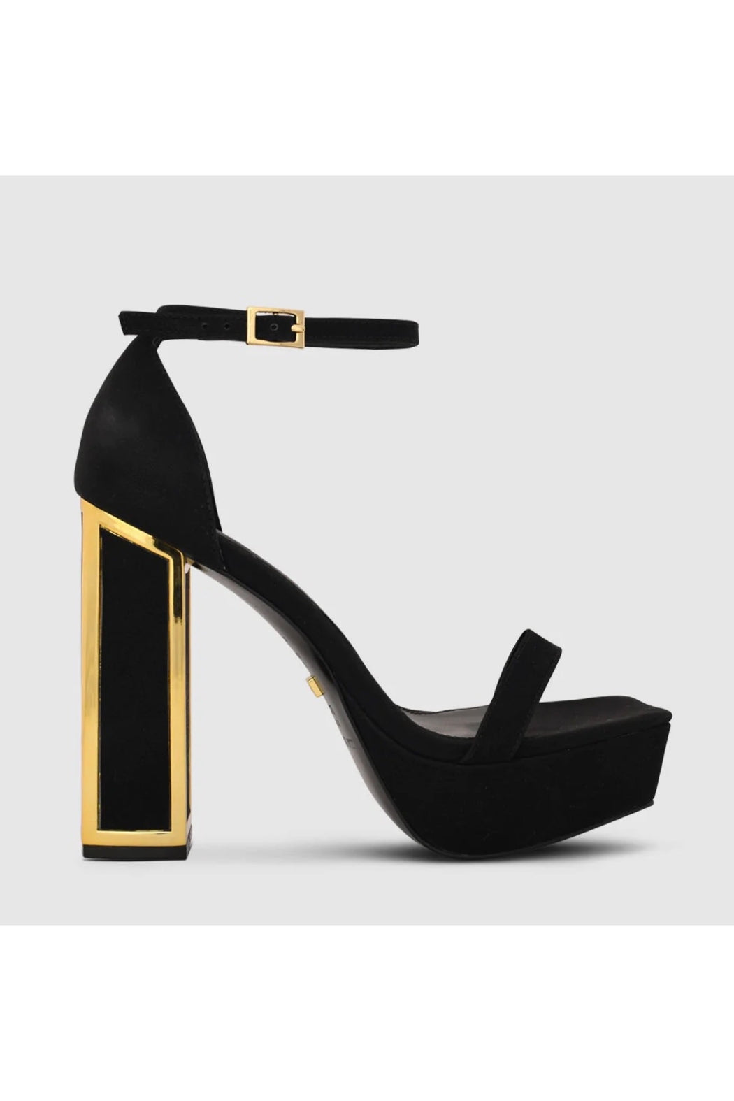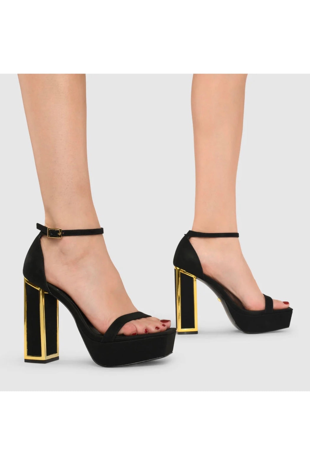 A lofty platform and block heel elevate a square-toe sandal secured by a slender ankle strap with an adjustable buckle closure.