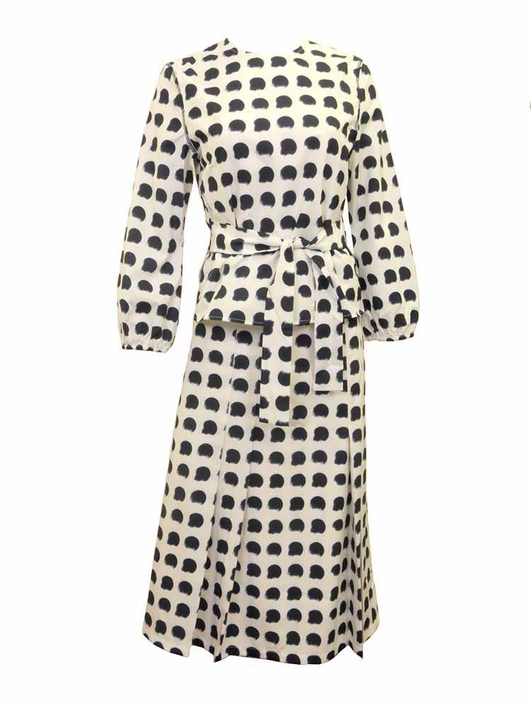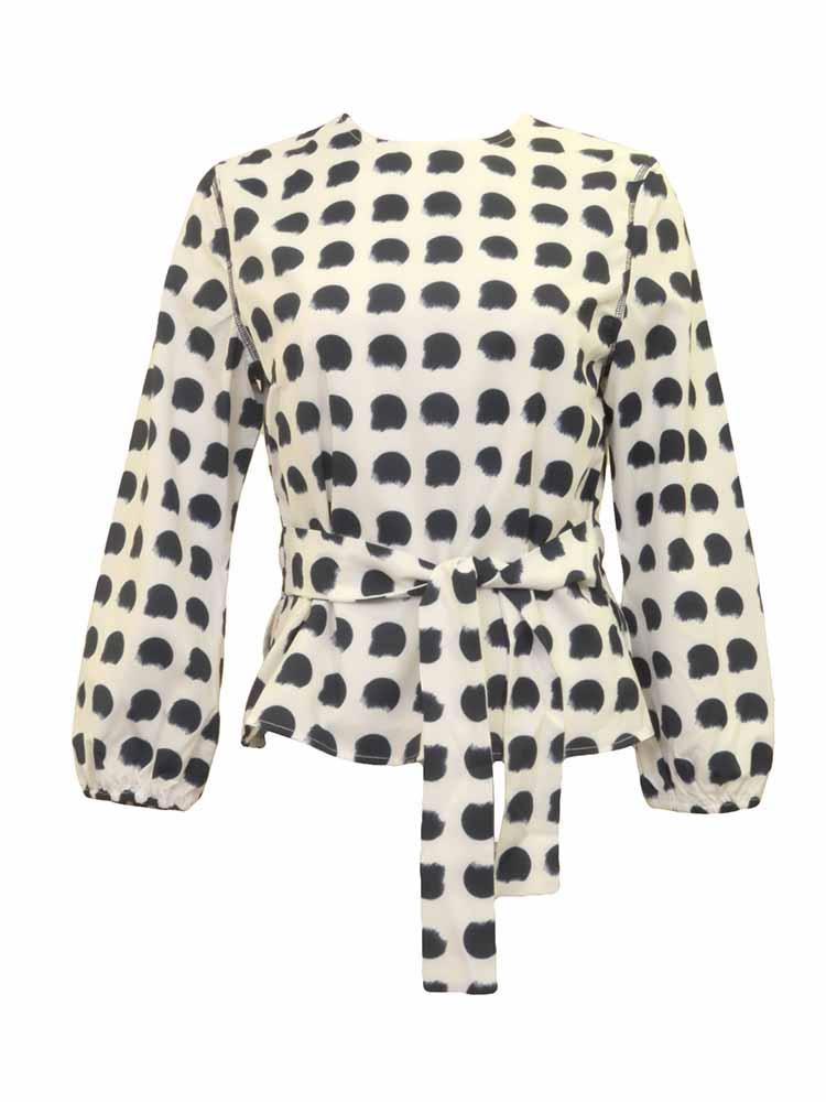 Crew-neckline lightweight all over print blouse with bubbled sleeves and tie at waist. Midway zipper in back, comes in two colors.