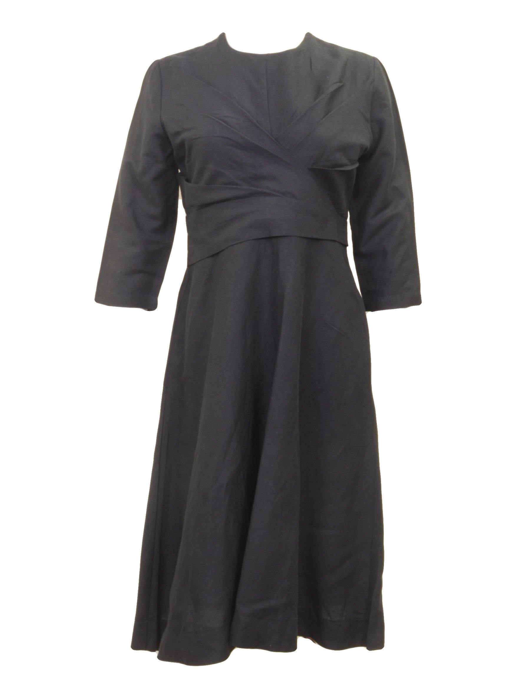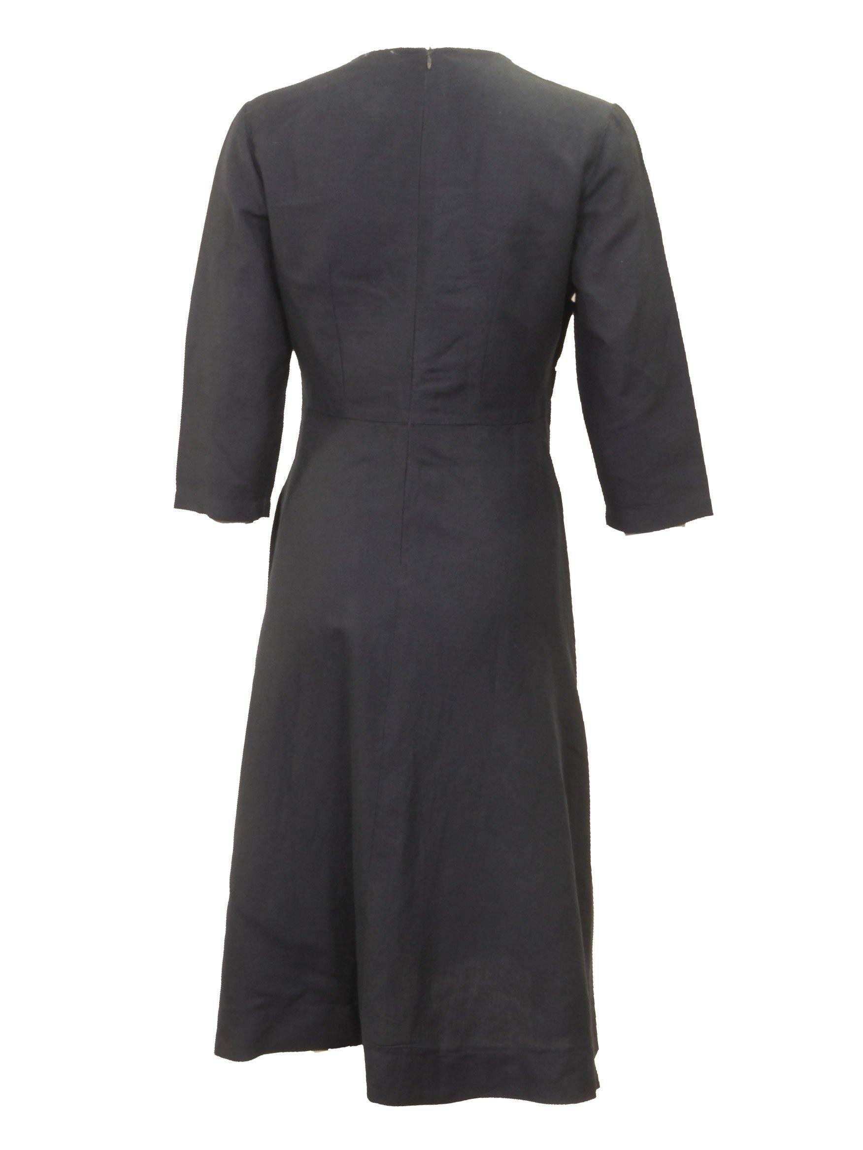 Three quarter sleeve linen a-line dress with gathered wrap bust-line. This dress has hidden zippers on the sides. Who doesnt love a dress with pockets!