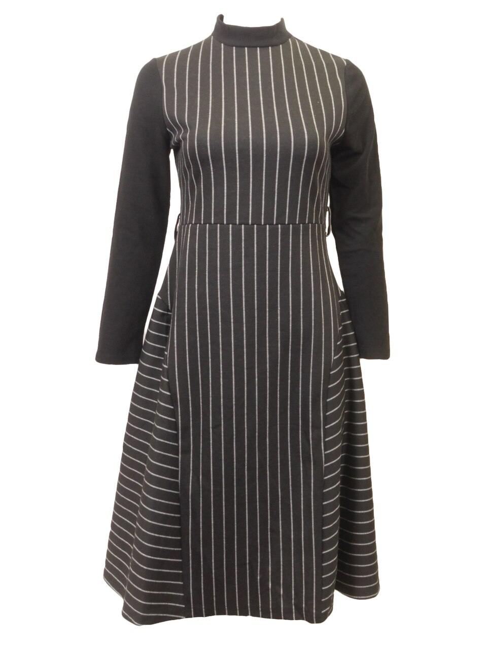 Women's black and white pinstripe dress with sweater high neck and flairy bottom