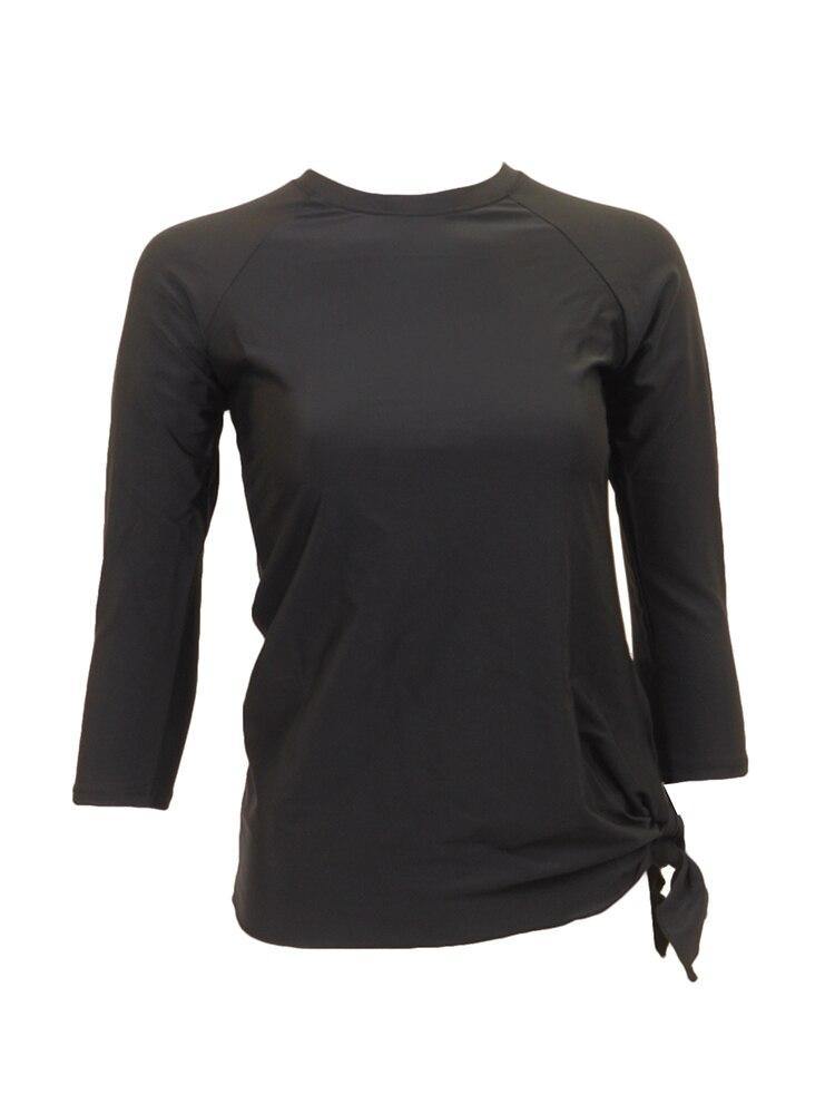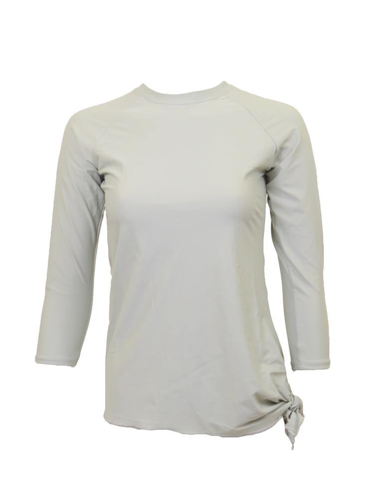 Crewneck 3/4 sleeve nylon swim shirt with tie on the side of the waist
